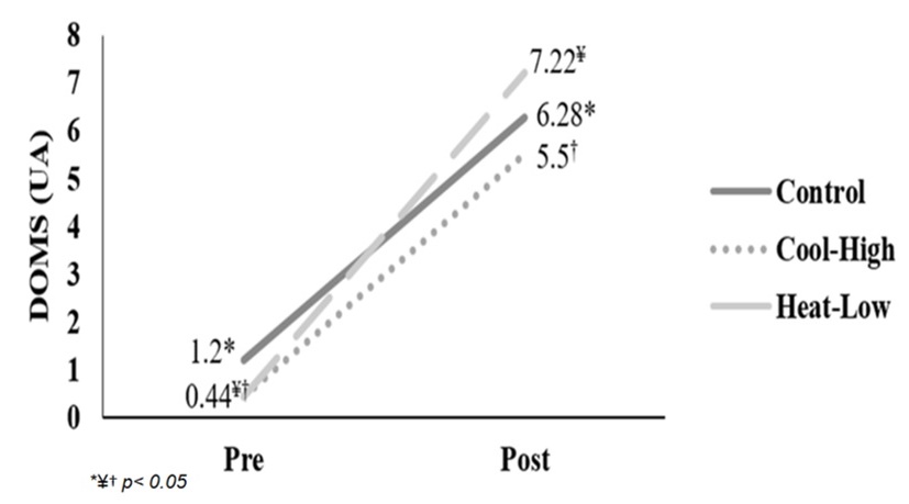 The participants in this study perceived more DOMS in low-heat conditions compared to the other two scenarios; this may be due to the effect of higher heat stress perceived during exercising in the heat (Schlader, Stannard & Mundel, 2009). It is common that, during and after physical exertions, the sensation of pain increases although, it can also be maintained between 6 to 8 hours after the effort is made (Vanshika, 2012). The sensation of pain increases during and after a race due to the micro-ruptures of muscle and muscle-tendinous fibers, which causes an inflammatory response (Lewis, Ruby, & Bush-Joseph, 2012). Likewise, when individuals perform physical exercise under heat conditions, they perceive a greater sensation of fatigue and acute pain than in other environments due to the high metabolic demands necessary to execute all the processes of loss of body heat (Schlader, Stannard, & Mundel, 2009).
