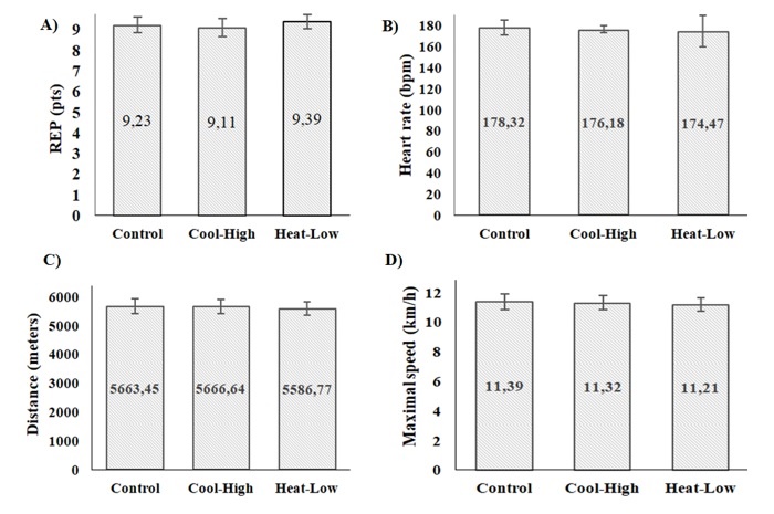Figure 4 shows no significant difference among conditions in RPE (F(2,57): 0.566, p=0.571), heart rate (F(2,57): 0.173, p=0.841,), distance covered (F(2,57): 0.150, p=0.861), and maximal speed (F(2,57): 0.148, p=0.863).