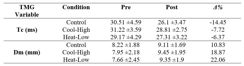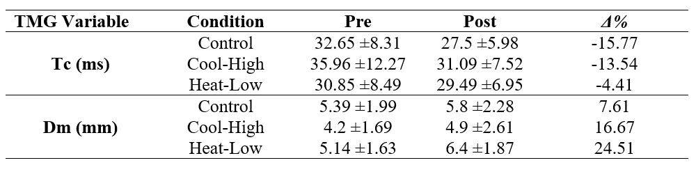 Table 3 shows no significant interaction for Tc (F(2,57): 2.409, p=0.099, ωp2=0.04), and Dm (F(2,57): 1.117, p=0.334, ωp2=0) in the rectus femoris muscle. However, there was a significant pre-post decrease in Tc (F(2,57): 33.824, p<0.01, ωp2=0.52), and a significant increase in Dm (F(2,57): 36.25, p<0.01, ωp2=0.54).