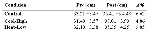 Table 1 shows no significant interaction in CMJ (F(2,57): 1.218, p=0.303, ωp2=0.01). After main effect analysis, there was a significant difference between measurement moments (F(2,57): 28.504, p<0.01, ωp2=0.48) as follows: Control (F(2,57): 8.7, p<0.01), Cool-High (F(2,57): 4.2, p=0.045) and Heat-Low (F(2,57):18.02, p<0.01). No differences between conditions were found (F(2,57): 1.9, p=0.162).