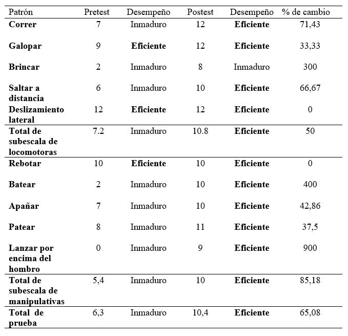 En la tabla 1, se presentan los resultados de los valores obtenidos en las destrezas locomotoras y manipulativas pre- y posttest, así como el total de las subescalas, total de la prueba y porcentaje de cambio. Igualmente, en esta misma tabla, se incluye el desempeño del niño de cada patrón, subescala y total, antes y después de la intervención. Cabe señalar que el valor máximo del IBM en puntuación por patrón es 12 y con valores superiores a 9 se considera que el patrón básico es eficiente y maduro (Jiménez et al., 2013).