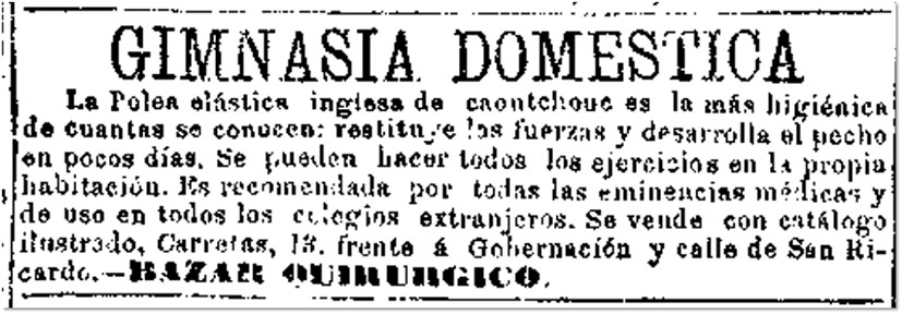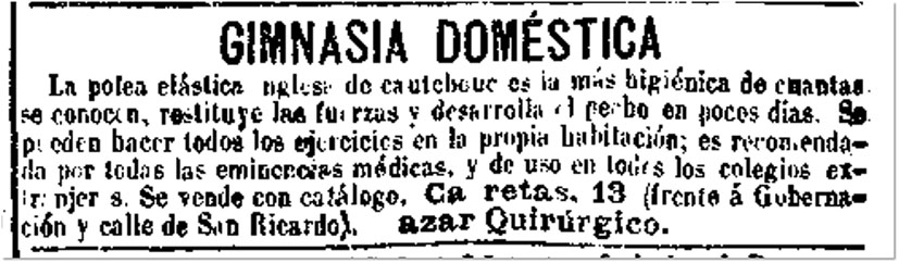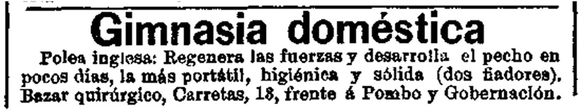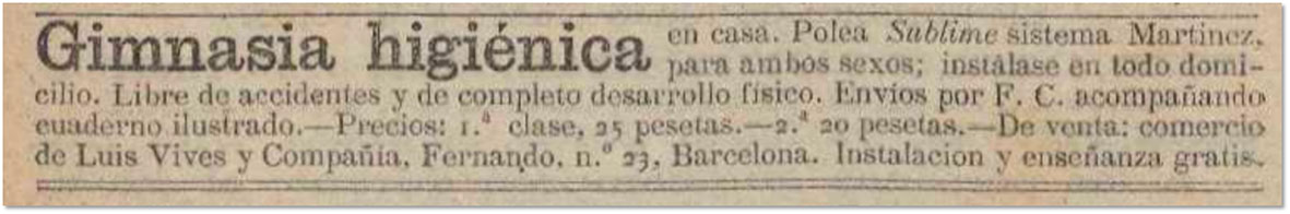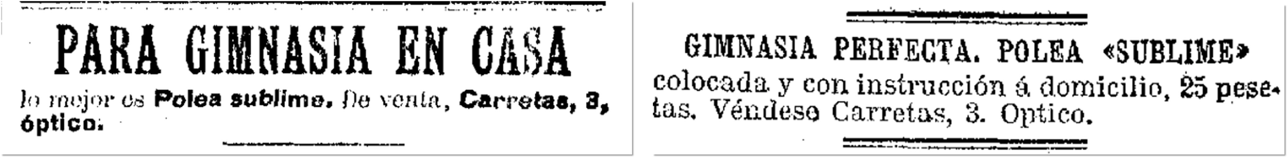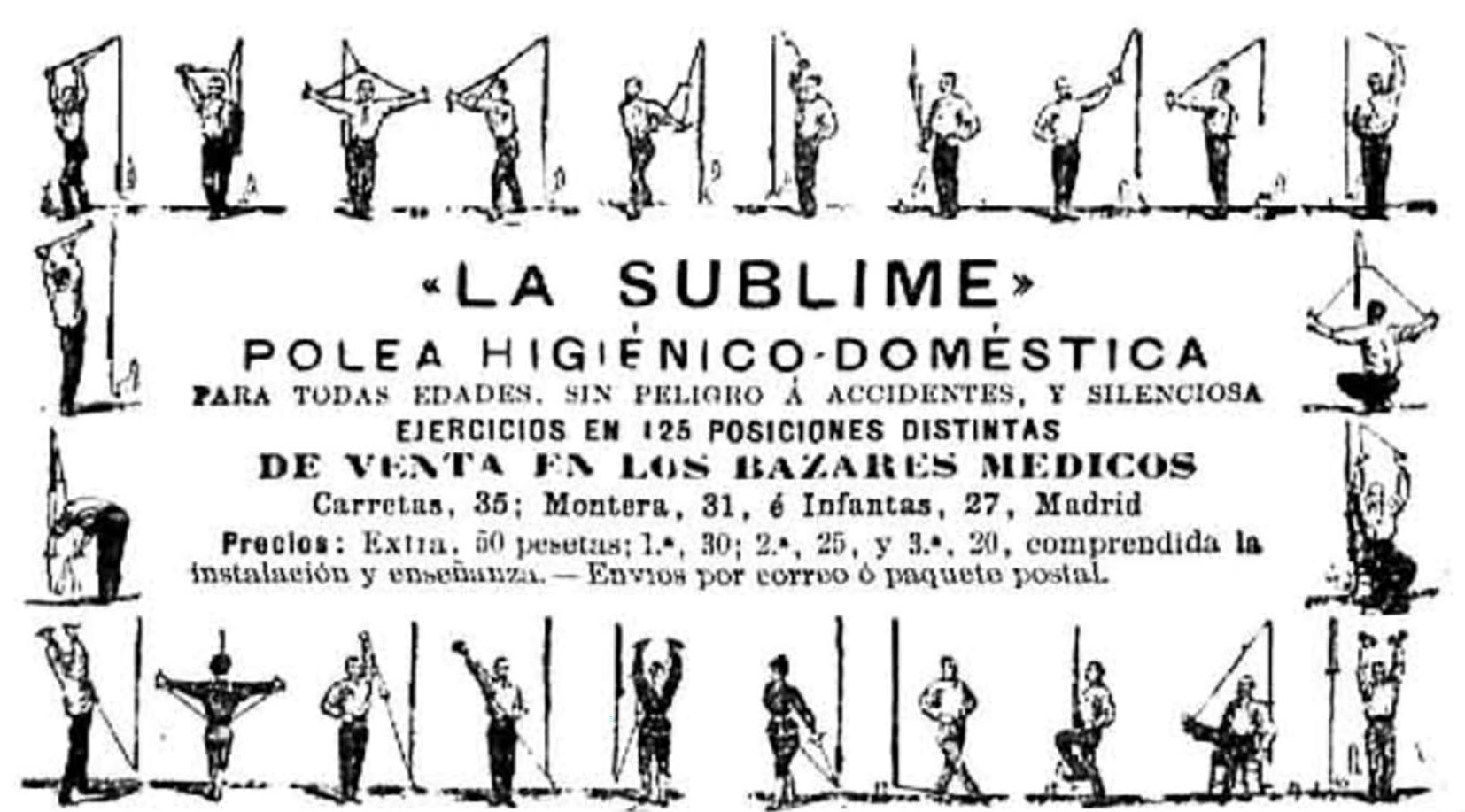 Hacia finales del siglo XIX fue habitual la venta de aparatos de gimnasia doméstica. Esteban Martínez Díaz, más conocido por ser el capitán aeronauta que con el mismo nombre se destacó a cargo de una compañía gimnástico-aerostática, daba a conocer la polea “sublime” (Martínez Díaz, 1891). En La Dinastía (8 de marzo de 1891, p. 2) aparecía la siguiente noticia: