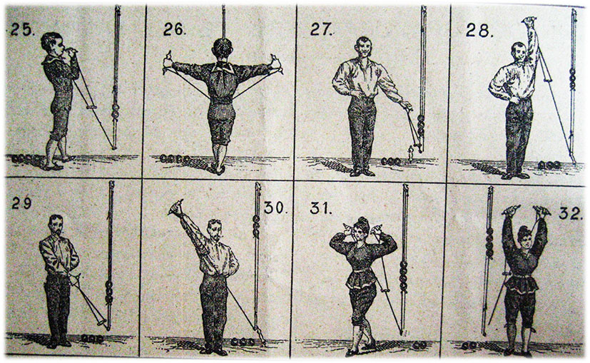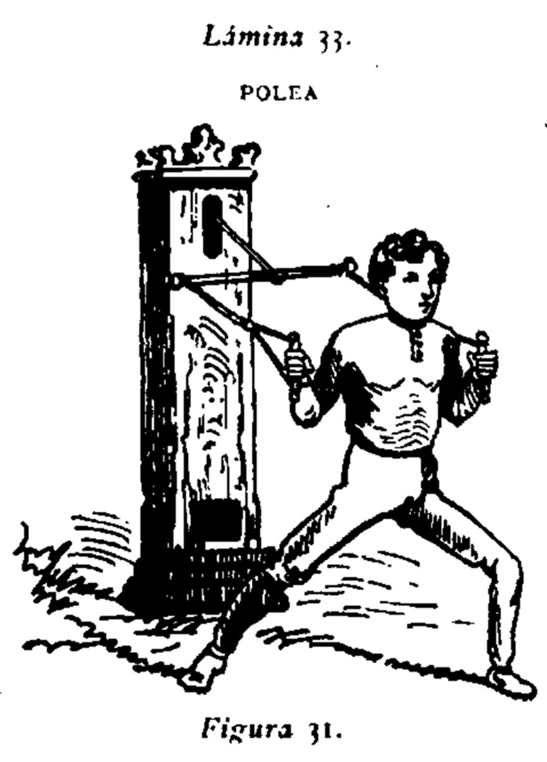 Ciertamente no ofrece los excelentes y poderosos recursos de la gimnasia moderna: pero a las ventajas de todos los trabajos a pie firme en que para la estabilidad y firmeza se necesita poner en juego todos los extensores y flexores del tronco y piernas, reúne la facilidad y la comodidad de fijar este sencillo aparato en cualquier parte, al aire libre, en una habitación, gabinete, despacho, baño, etc. y sin salir de su aposento el hombre de bufete, el literato, el filósofo, pueden desperezar sus miembros entorpecidos por una larga vigilia o trabajo mental, reanimar su lenta circulación sanguínea, desarrollar el calórico, promover el sudor y adquirir soltura en la locomovilidad general y parcial. (Busqué y Torró, 1865, p. 56)