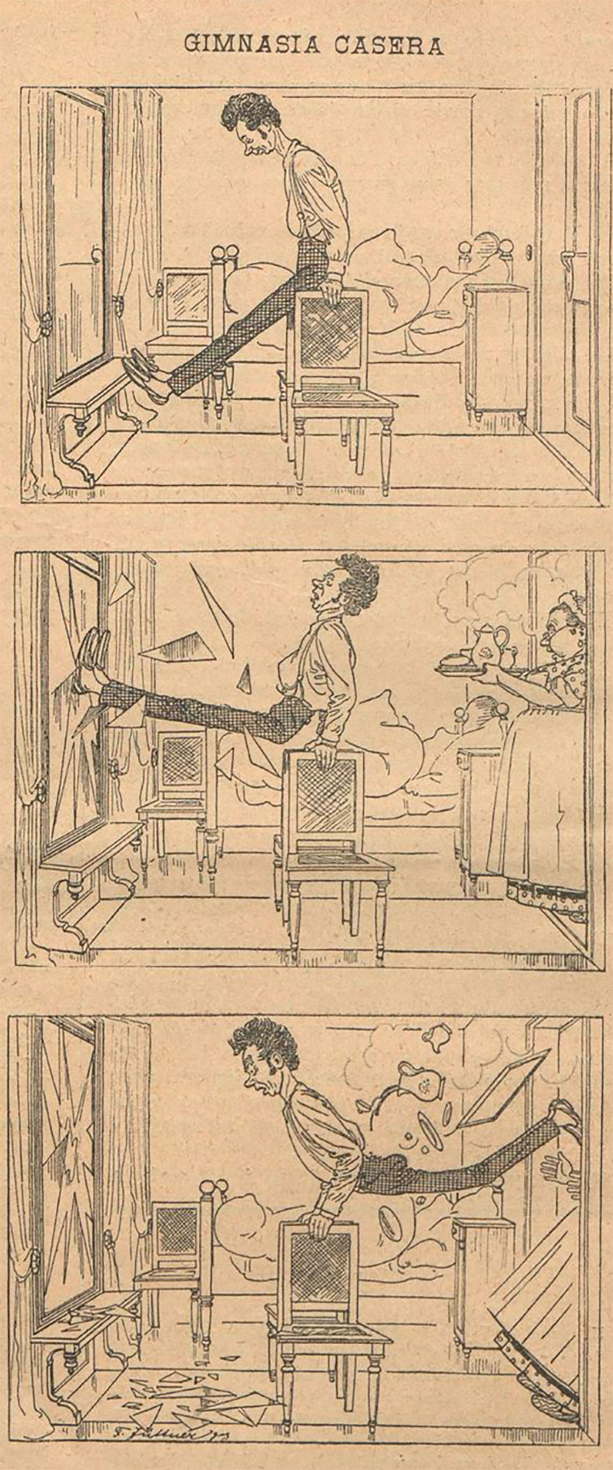 Muchas personas aficionadas a los ejercicios gimnásticos no hacen más que saltar el lecho y sin cubrirse las carnes, cogen las pesas y las levantan a la altura de la frente diez o doce veces seguidas; otros se agarran al boliche del catre y se estiran todo lo posible, para los desentumecer los músculos; algunos se lanzan por el pasillo en paños menores y dan unas cuantas carreras vertiginosas, para conseguir la elasticidad de las articulaciones, según ellos dicen. (Taboada, 1892, p. 1)