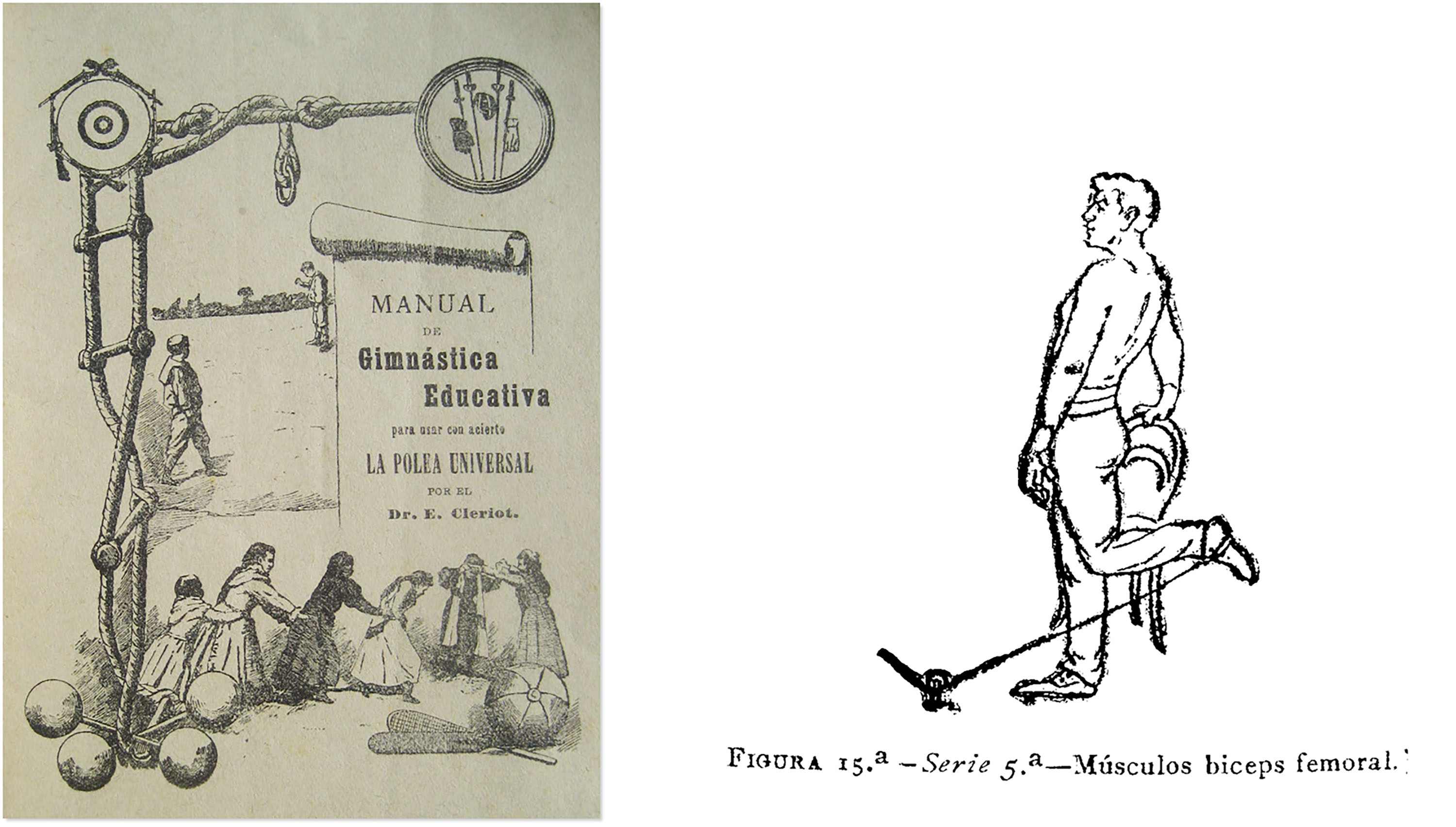 En cuanto a la polea universal, es por decirlo así, una pequeña enciclopedia de los movimientos gimnásticos; representa la más económica y completa instalación gimnástica de sala; de gran facilidad en el manejo, sin exposición alguna, reúne a las anteriores condiciones otras de gran valor: da fuerza y vigor, y cierta elegancia cuando se ejecutan bien sus diversas y numerosas aplicaciones; sirven unas para gimnasia higiénica, para la pedagógica o educativa otras, y por último para la terapéutica las restantes; por tales razones, este precioso aparato no debe de faltar en casa, en la escuela, en el colegio y en los hospitales y en los sanatorios. (Cleriot, 1900, pp. 6-7)
