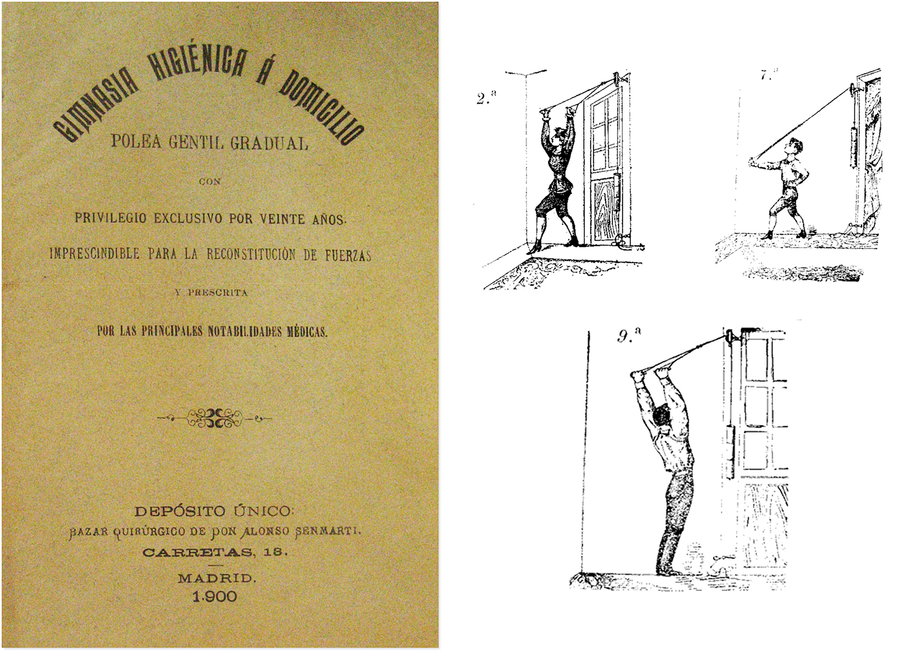 A comienzos del siglo pasado la “gimnasia doméstica” entró en una mayor visibilidad publicitaria. El Dr. E. Cleriot, uno de los principales representantes de la gimnástica sueca en Madrid, presentó uno de los aparatos gimnásticos que más se difundieron a lo largo de todo el siglo, la “polea universal”. Aunque el autor recomendase la polea para todo tipo de establecimientos y de gimnásticas, el genuino sistema era la concepción más moderna del “gimnasio en casa”. La obra presenta 18 ejercicios, con ilustraciones, que atendían la posición inicial, el movimiento desarrollado y los efectos producidos (Figura 19).