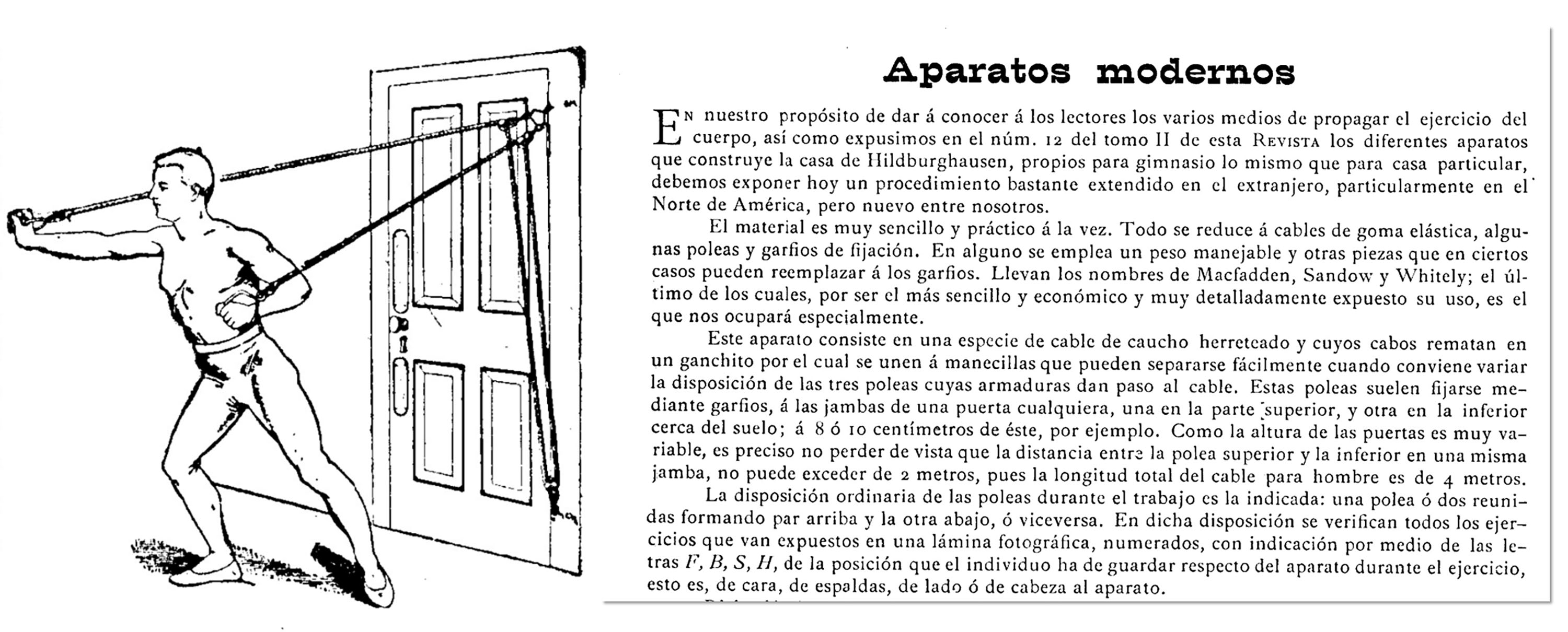 El doctor David Ferrer (1900) en Los Deportes –la revista de educación física y de deportes más importante de España (1897-1910)– se ocupaba de los avances de la gimnasia moderna. Mencionaba que la gimnasia en casa se había desarrollado muchísimo en el extranjero y, particularmente, en América del Norte. Entre los modernos aparatos destacaba los cables de goma elástica Whitely (figura 21).