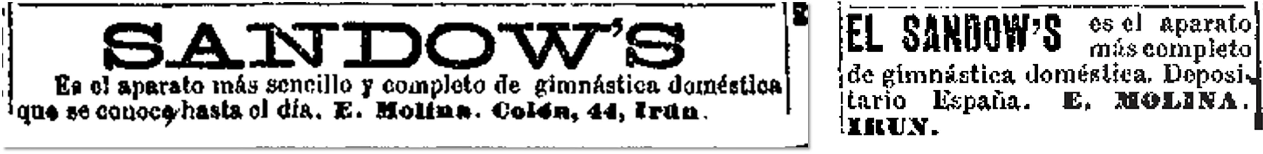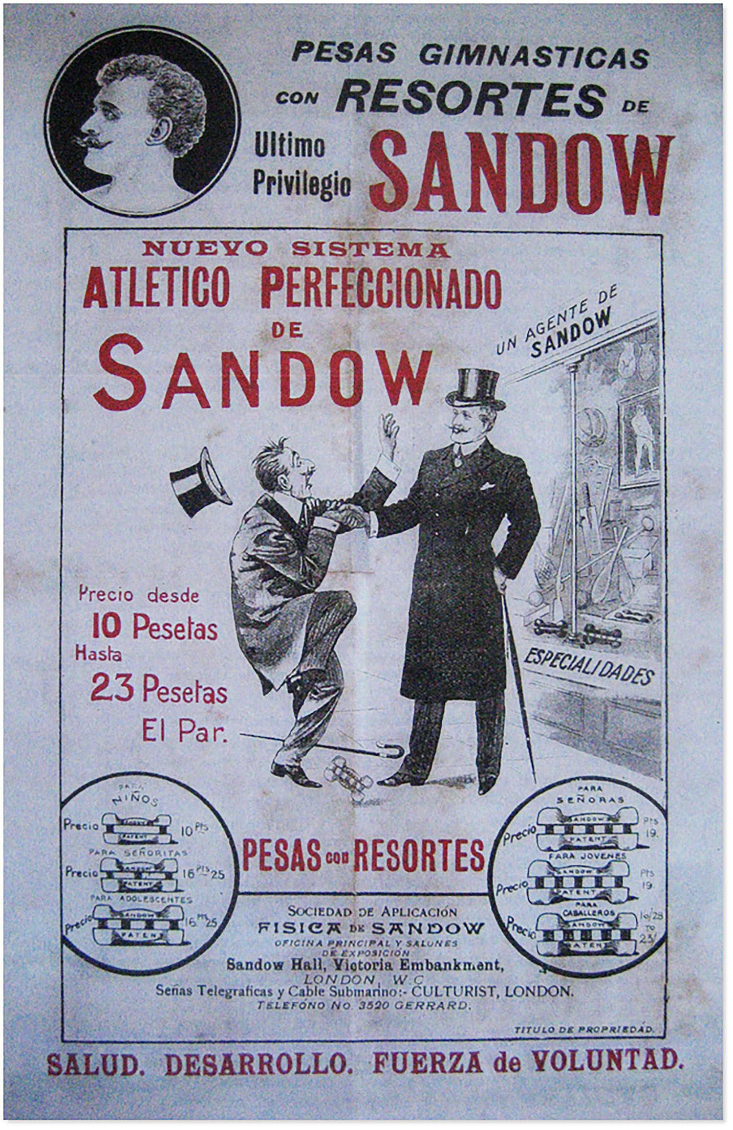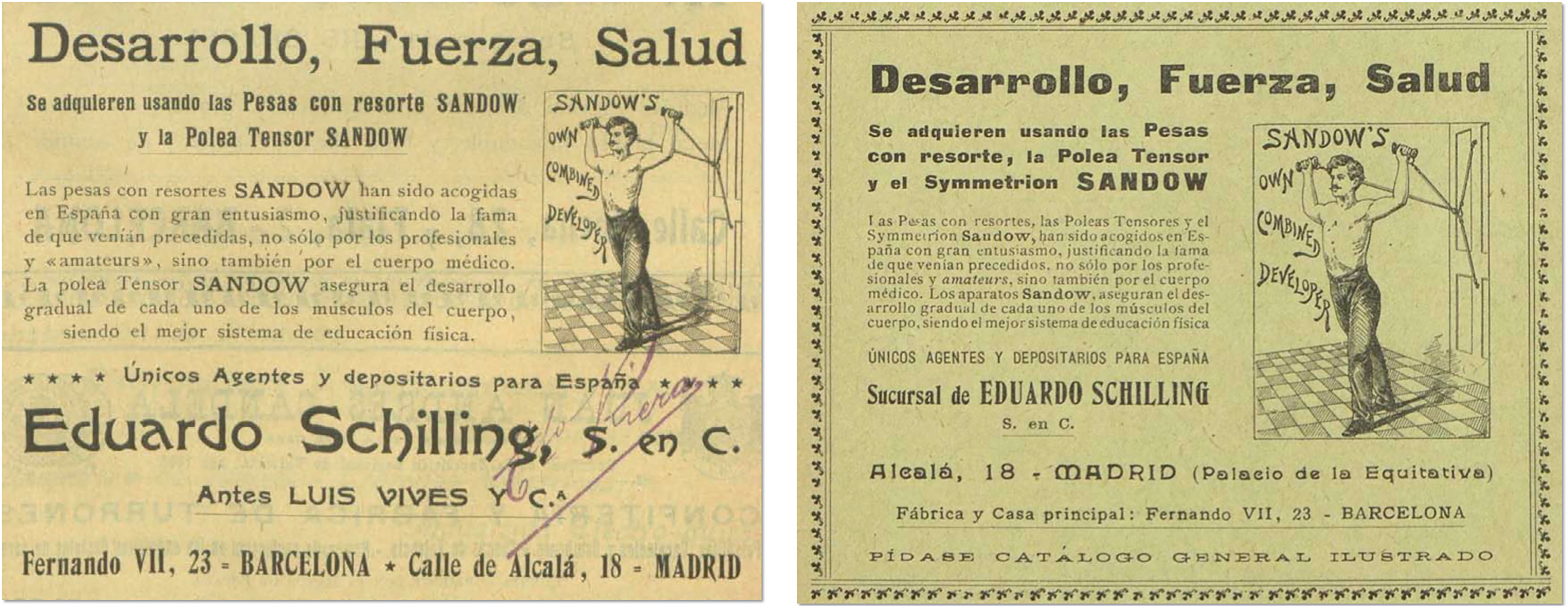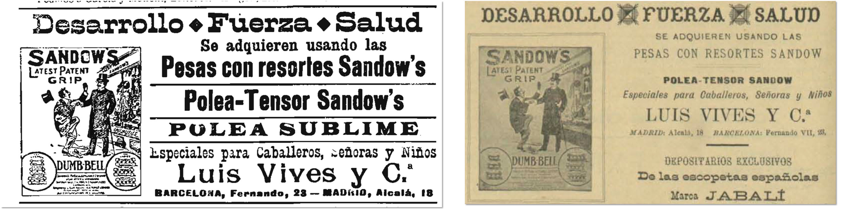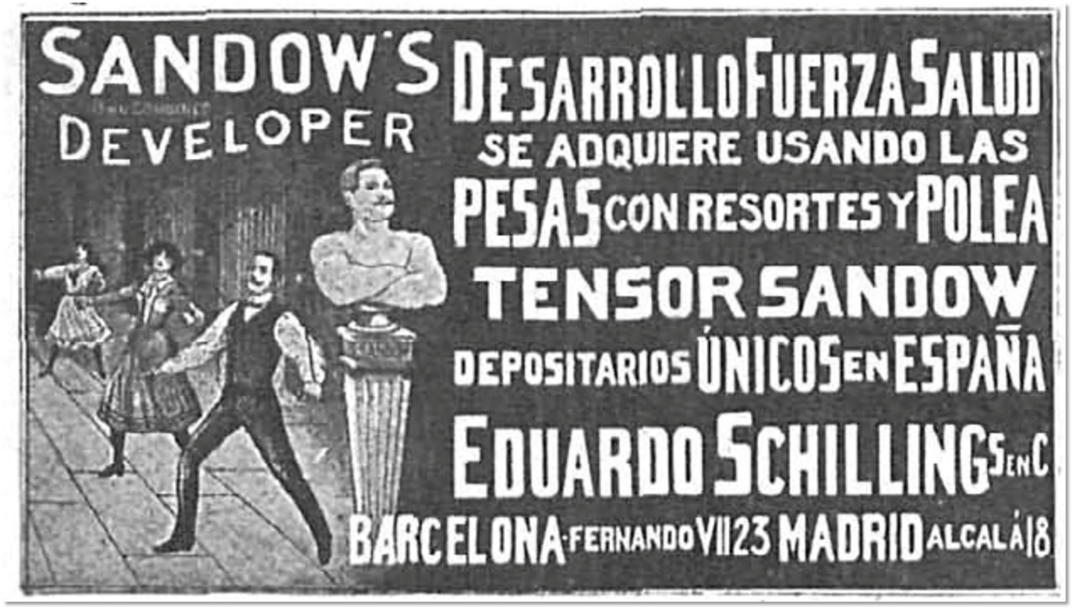 A principios del siglo XX, la prensa barcelonesa (La Publicidad y La Veu de Cataluña) comenzó a publicitar los productos gimnásticos de Eugenio Sandow: las pesas con resortes Sandow y la polea-tensor Sandow.