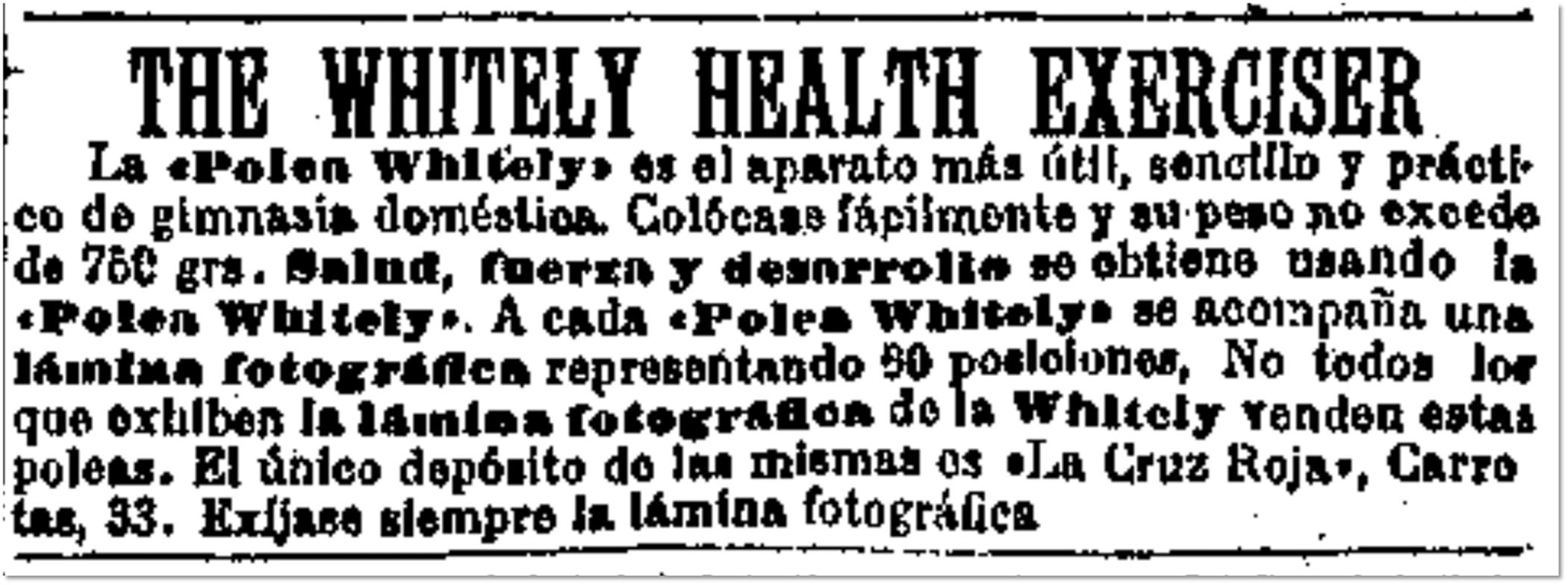 es el aparato más útil, sencillo y práctico de la gimnasia doméstica. Colocase fácilmente y su peso no excede de 750 grs. Salud, fuerza y desarrollo se obtiene usando la “Polea Whitely”. A cada “Polea Whitely” se acompaña una lámina fotográfica representando 50 posiciones. No todos los que exhiben la lámina fotográfica de Whitely venden estas poleas. (Whitely, 1901, p. 4).