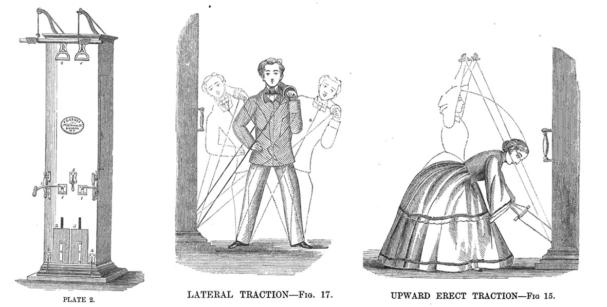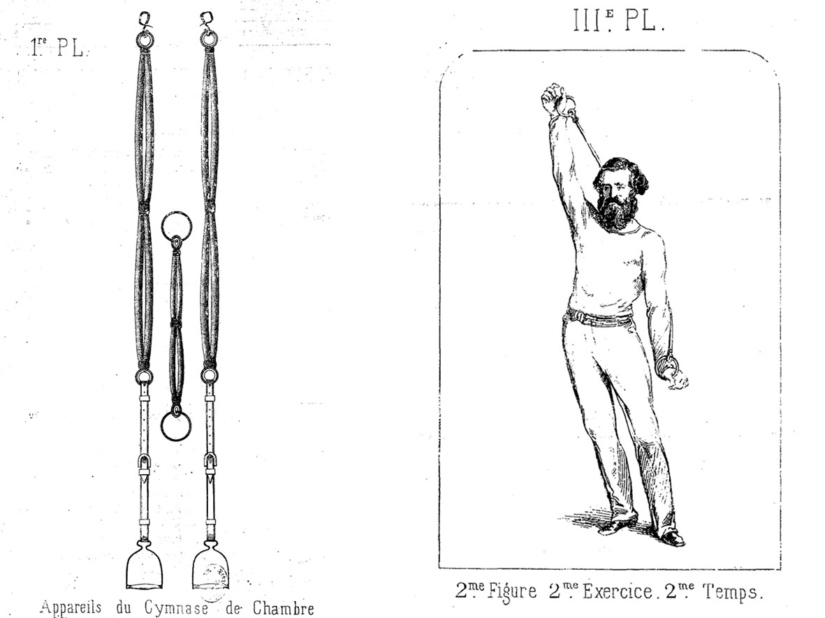 Entre las muchas máquinas inventadas, las de poleas fueron las más conocidas, ya que tenían la ventaja de poder ser utilizadas en el espacio privado, es decir, en el hogar. Así se introdujeron en el mercado las primeras máquinas gimnásticas por poleas como la inventada, en 1859, por los franceses de René Vian y Josep Charles Burlot, los cuales ya disponían en París –en 1862– de un comercio de máquinas gimnásticas de salón en la Rue Roussell, 21 (Schreiber, 1884) (Ver Figura 1).