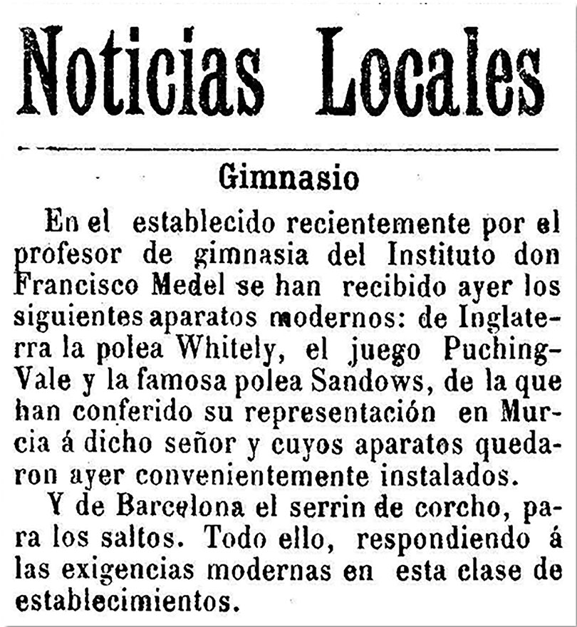 Los productos de Sandow fueron divulgados por toda España: “Sandow’s el aparato más sencillo y completo de gimnástica doméstica que se conoce hasta el día” (Molina, 1900, p. 4). Asimismo, los gimnasios también se proveían de estos aparatos, como así lo hizo en Murcia el Gimnasio Modelo de Francisco Medel que, entre los aparatos modernos, incorporó las poleas de Whitely y de Sandow, haciéndose cargo de la representación en Murcia de estas marcas (Medel, 1900) (Figura 23)