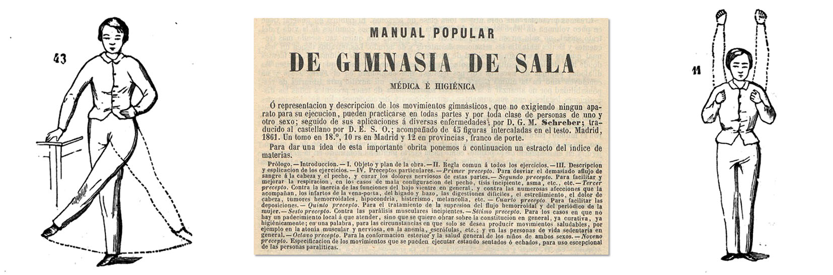 Pero no todo era utilizar estas máquinas. El primero en divulgar un método de gimnasia sin aparatos fue el alemán Daniel Gottlob Moritz Schreber (1808-1861), profesor de medicina interna y de farmacología en la Universidad de Leipzig y, posteriormente, director del Instituto Ortopédico; fue considerado uno de los patronos de la gimnástica sueca en Prusia. En España presentó el Manual popular de gimnasia de sala (1861) que, según Torrebadella (2014), fue la obra más conocida del siglo XIX y la que acreditó una confianza en la “gimnástica médica”. Los ejercidos de Schreber eran muy sencillos y podían ser realizados en cualquier lugar, en la misma casa o en el trabajo, aunque siempre era preferible al aire libre (Figura 3). Cada ejercicio tenía su orientación médica, es decir, su aplicación curativa o benefactora para el organismo.