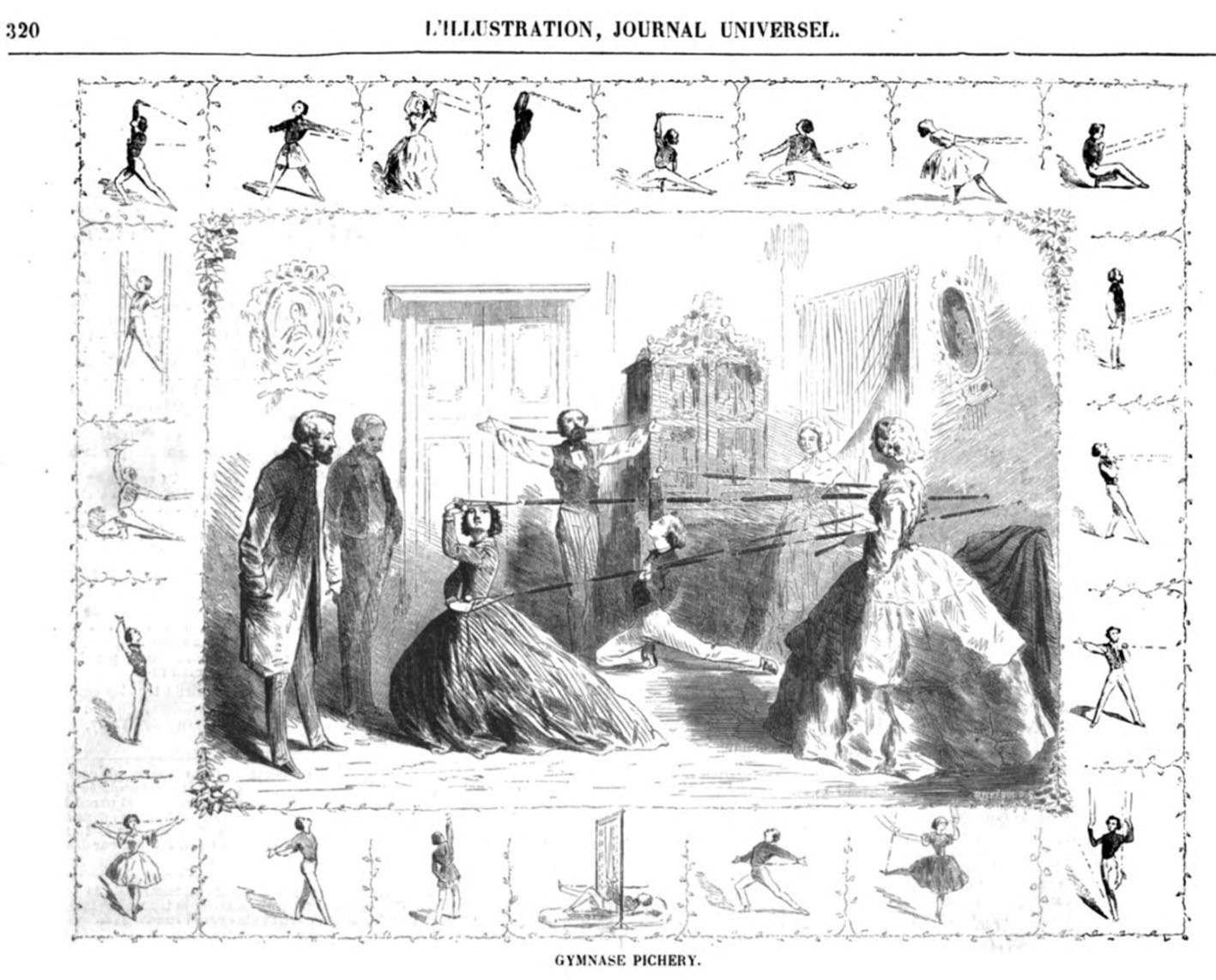 Posteriormente, Ph. J. B. Carue, el más importante fabricante y proveedor de aparatos de gimnástica que existía en Francia y reconocido internacionalmente, presentó el Tratado práctico de gimnástica higiénica para ambos sexos (Carue, 1880) –cuya primera edición francesa es de 1868–. En esta obra de 52 páginas aparecen el detalle de 26 ejercicios – tensores, mazas y pesas–, entre estos los populares resortes de muelles de Pichery (Figura 5), pero perfeccionados al substituir los muelles por cordones elásticos.