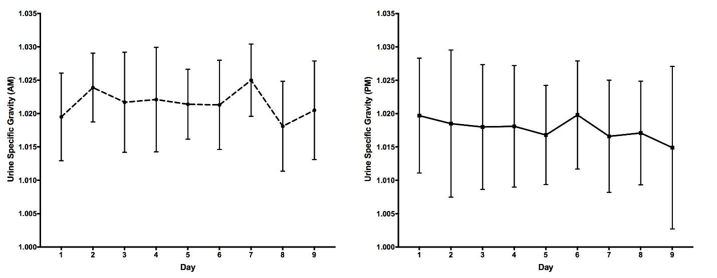 Participants were asked to collect a mid-stream urine sample in a sterile, 4 oz. specimen cup (Dynarex no. 4254, Dynarex, Orangeburg, NY, USA), to ensure a clean sample for later assessment. Daily samples were collected by the investigator each PM. Samples were analyzed within 24 hours. This method is supported by Adams and et al. (2017) who found that urinary hydration markers were stable 1-2 days after collection, with no change in Usg.