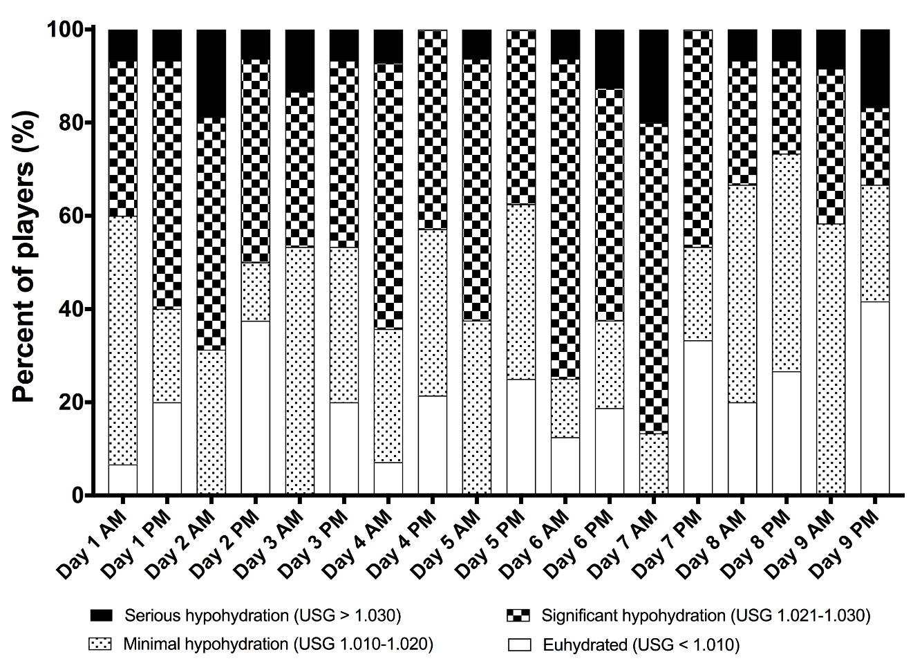 In contrast, our study indicates that the percentage of players that presented in the euhydrated state (Usg ˂ 1.010) in the AM and PM were less than 40% over the 9 days. The highest percentage of players presenting the euhydrated state occurred on Day 8 in the AM (20%) and Day 9 in the PM (42%). Day 1 PM and Day 2 PM, only 20% and 25% of players presented themselves in a euhydrated state to play, respectively. Daily AM and PM percent of total players within each hydration classification is displayed in Figure 2.