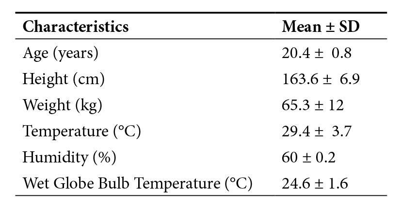 Data were collected over a 2-week period during a regular National Association of Intercollegiate Athletics (NAIA) women’s soccer season. Participants were asked to collect two urine samples per day. Urine specimens were collected from each player in the morning (AM) and evening approximately one hour before pre-practice or game (PM). Each sample were collected by the player in a sterilized, pre-sealed container distributed the day prior. Urine was used to evaluate the hydration status via the use of urine specific gravity (Usg), and hydration status was classified based on cut-off values recommended by NATA position statement on fluid replacement for players (Casa et al., 2000). Samples were collected Monday through Friday; weekend samples were not required for this study. In total, over the period of 2 weeks, 9 days’ worth of urine samples were collected and analyzed for hydrational status. Additionally, environmental variables were monitored prior to every PM practice/game, but were not controlled for in our study. Temperatures (oC), humidity (%), and Wet Bulb Globe Temperatures (WBGTs) over the course of the study were 29.4 ± 3.7oC, 60 ± 0.2%, and 24.6 ± 1.6oC, which were not controlled for in our study.