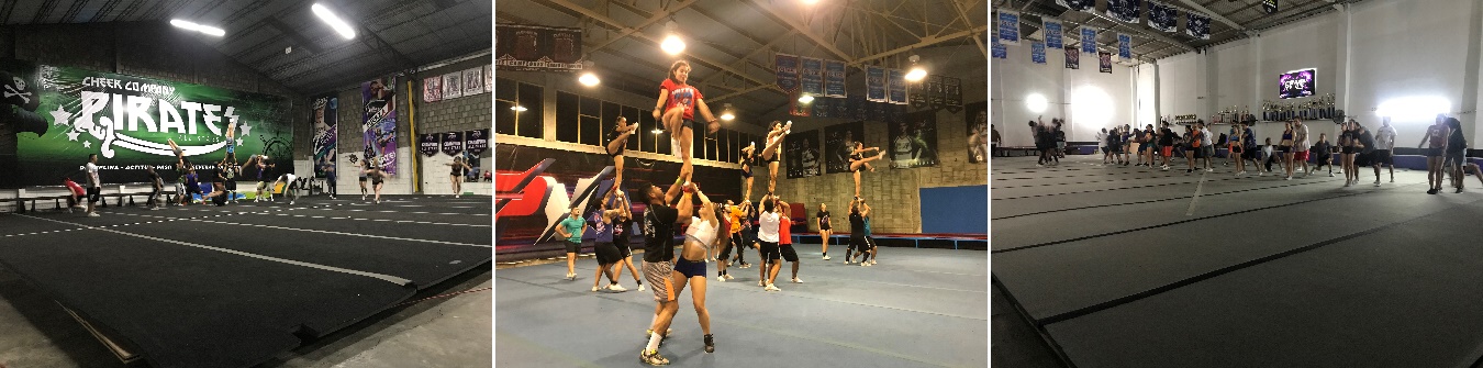 Los datos se recolectaron en las instalaciones en las que los equipos de porrismo entrenan sus rutinas completas. Son gimnasios amplios con espacio para el mat o piso especial para porrismo, el cual está conformado por nueve franjas unidas, que forman un rectángulo de 18 m por 12 m aproximadamente (figura 1).