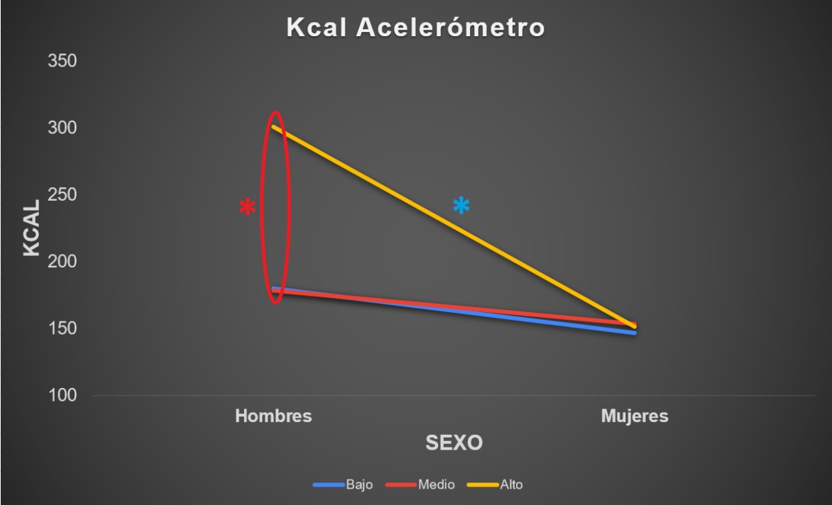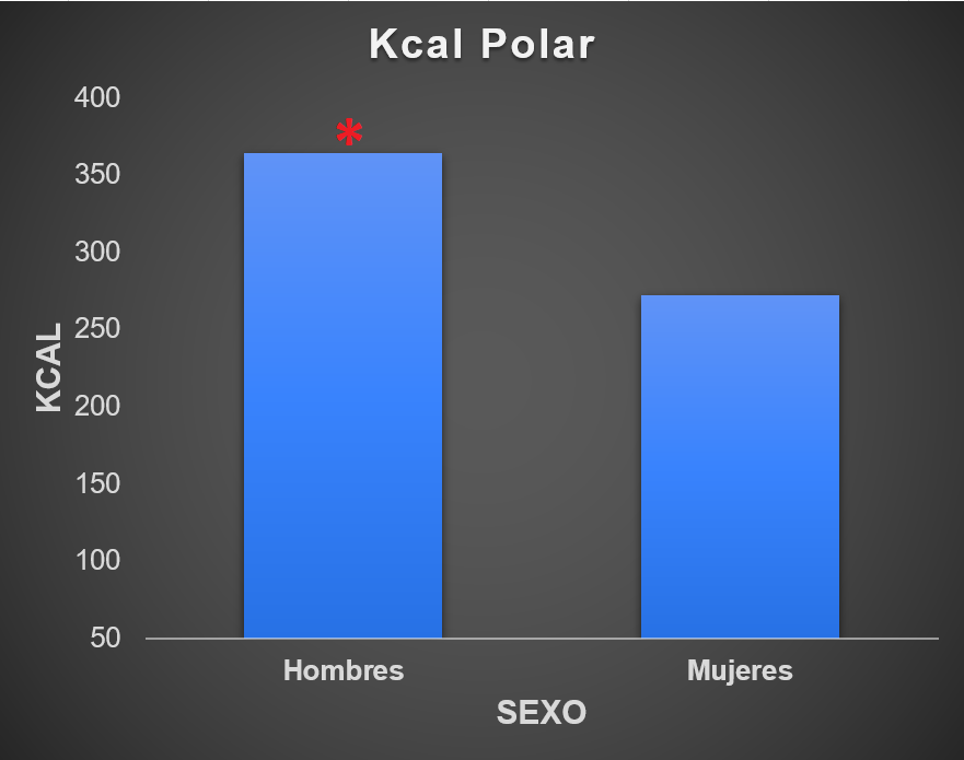 Ahora bien, de acuerdo con la información recolectada con los acelerómetros, se evidenció una interacción significativa (p = 0.008*) entre ambas variables independientes (figura 2), la cual muestra que los hombres de categoría de gimnasia “alta” tuvieron un gasto calórico (X̅ = 300.9 kcal) significativamente superior al de los hombres de categoría “media” (X̅ = 178.5 kcal) y “baja” (X̅ = 180.4 kcal), y aún más que las mujeres de todas la categorías (“alta” X̅ = 151.3 kcal; “media” X̅ = 153.5 kcal; “baja” X̅ = 146.8 kcal). Por otro lado, la información brindada por los pulsómetros mostró una diferencia significativa (p = 0.048*) entre sexos (figura 3), es decir, los hombres tuvieron un mayor gasto calórico que las mujeres.