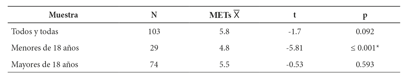 Por otro lado, tomando en cuenta el amplio rango de edad de los sujetos incluidos en el presente estudio (11.8-36 años), y sabiendo que el compendio de Ainsworth et al. (2011) llevó a cabo sus estudios con sujetos mayores de 18 años, fue necesario realizar un análisis adicional, el cual evidenció que los METs de los sujetos menores de 18 años son significativamente más bajos (N = 29, METs X̅ = 4.8, p ≤ 0.001*) que lo reportado en el compendio, mientras que los mayores de 18 años no tuvieron un gasto metabólico durante el entrenamiento significativamente diferente (N = 74, METs X̅ = 5.5, p = 0.593) con respecto a los datos reportados en el compendio. Es decir, los resultados fueron equivalentes al del compendio.