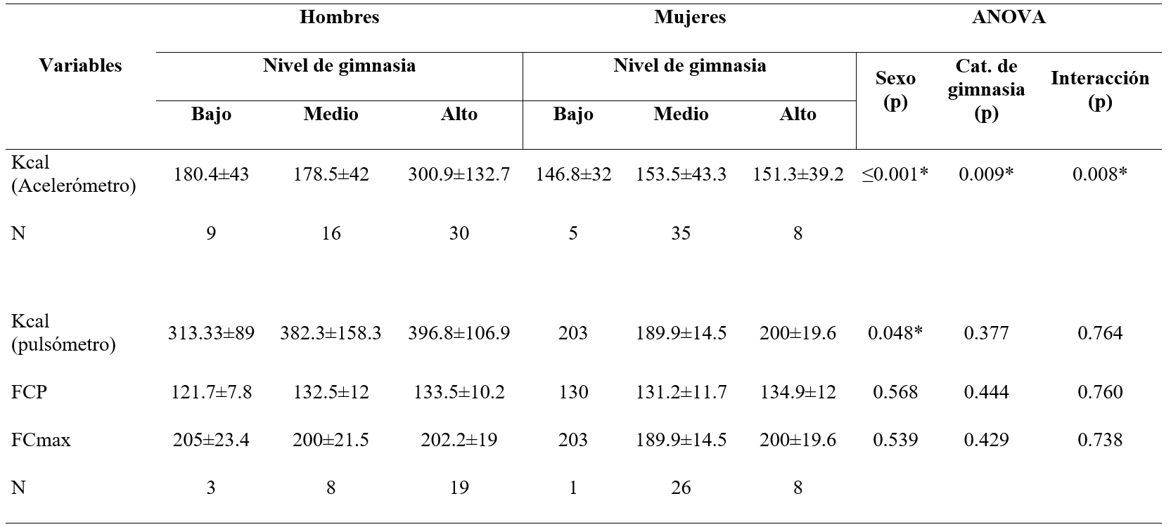 Por último, la variable de intensidad en términos de FCP no mostró diferencias significativas entre sexos (F = 0.33, p = 0.568), categoría de gimnasia (F = 0.82, p = 0.444) ni interacción significativa (F = 0.28, p = 0.760). En términos de FCmax tampoco hubo diferencias significativas entre sexos (F = 0.38, p = 0.539) ni categoría de gimnasia (F = 0.86, p = 0.429); asimismo, no hubo interacción significativa (F = 0.30, p= 0.738).