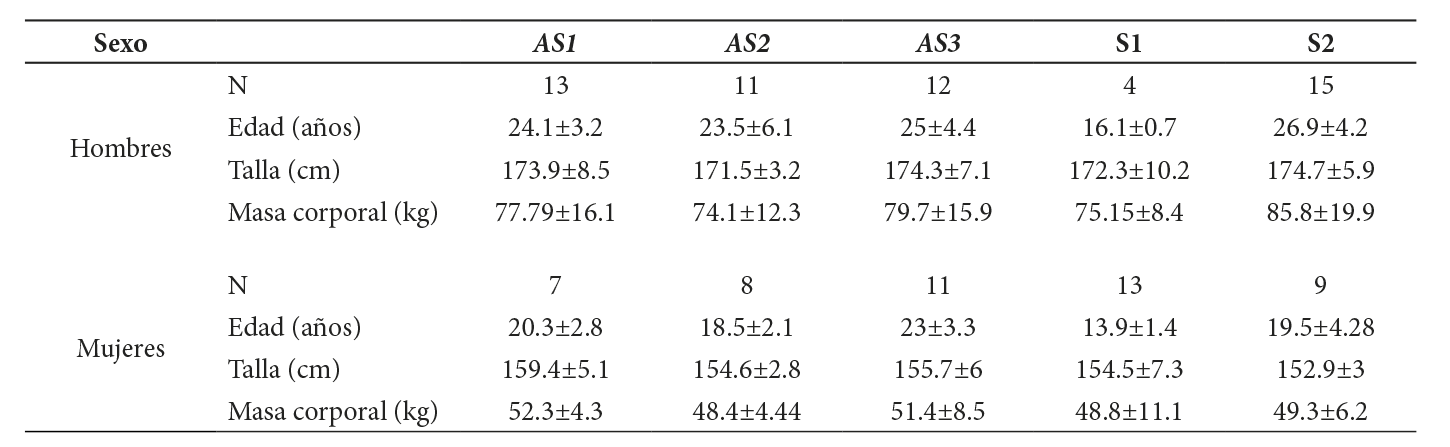 Participaron en el presente estudio porristas activos (n = 103; hombres = 55; mujeres = 48) de tres equipos all stars y dos selecciones nacionales de Costa Rica. La tabla 1 muestra las características que describen a la población participante en el presente estudio. El rango de edad de los equipos all stars es de 15 a 36 años, el de la selección nacional Coed de 14.8 a 34 años y, el de la selección nacional Junior 11.8 a 16.7 años. El rango de edad de toda la muestra es de 11.8 a 36 años.