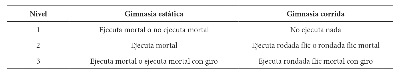 La categorización de rendimiento se realizó tomando en cuenta principalmente su nivel de gimnasia, debido a que, en porrismo, el nivel de gimnasia de piso es una variable esencial para determinar la exigencia física que un atleta específico cumple dentro de una rutina. Si bien es cierto, lo ideal es que todos y todas en un equipo dominen la máxima dificultad de gimnasia para su categoría y nivel en el que compite, esto es muy difícil de cumplir por diferentes razones (años de preparación, capacidad de aprendizaje de las acrobacias, entre otras). Los elementos gimnásticos que se tomaron en cuenta son los que se muestran a continuación en la tabla 2.