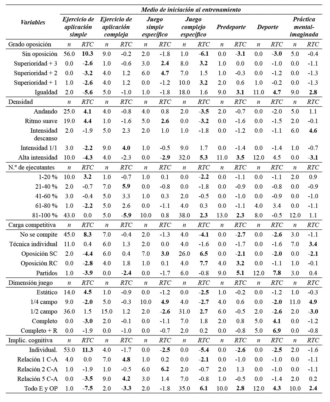 Se puede comprobar la existencia de 14 asociaciones entre las variables dependientes del estudio y el medio de iniciación al entrenamiento (MIE). Para analizar el grado de asociación entre las categorías de las variables, se muestran los resultados descriptivos y los residuos tipificados corregidos (RTC) de las variables significativas cualitativas, en las tablas 4, 5 y 6; igualmente, para mostrar el modo de actuación del cuerpo técnico en fútbol, en edad escolar, sub-12. En la tabla 4, se evidencian las asociaciones entre el MIE y las variables cualitativas pedagógicas significativas en el estudio de fútbol.