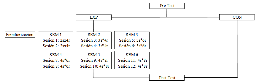 El estudio corresponde a una investigación de tipo experimental con diseño de pos prueba y grupo de control (Hernández et al., 2010) . El grupo EXP llevó a cabo un protocolo de entrenamiento para la musculatura isquiosural basado en el ejercicio Curl nórdico; y el grupo CON solo realizó las clases habituales de educación física. Para la identificación de los niveles iniciales se aplicó un test de velocidad en 20 mts. Posterior a esto, el entrenamiento se desarrolló durante 6 semanas, con una frecuencia de 2 sesiones por semana. Las sesiones fueron aplicadas los lunes y miércoles, durante la tarde, con una separación de 48 horas entre sesión. Los entrenamientos fueron dirigidos por el profesor a cargo de las clases de educación física y desarrollados en el establecimiento educacional al cual pertenecían los sujetos de estudio. El grupo EXP realizó los protocolos de entrenamiento en sesiones extra a las clases habituales de educación física, el grupo CON solo las sesiones de educación física correspondientes (~140 minutos/sem). Se realizó la evaluación final 48 hrs. posterior a la última sesión de entrenamiento (Figura 1). El personal de tutoría firmó un consentimiento informado y los sujetos participantes el respectivo asentimiento. El estudio fue llevado a cabo de acuerdo con los principios establecidos en la declaración de Helsinki (Asociación Médica Mundial, 2017).