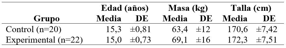 La Tabla 1 muestra la selección y asignación de los grupos control y experimental, con sus respectivas características de edad, masa corporal, talla con la finalidad de caracterizar la muestra.