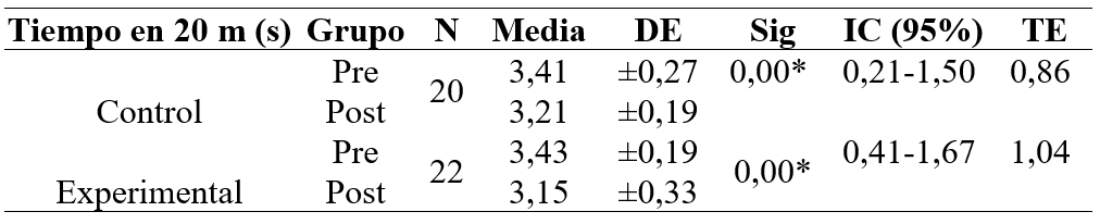 La Tabla 2 muestra los resultados de los análisis intragrupo obtenidos en el sprint de 20 metros para el grupo control (CON) y el grupo experimental (EXP) al finalizar el trabajo de 6 semanas. Se observan incrementos en la velocidad en ambos grupos, siendo estos estadísticamente significativos (p=0,00) y con un tamaño del efecto grande para ambos grupos.