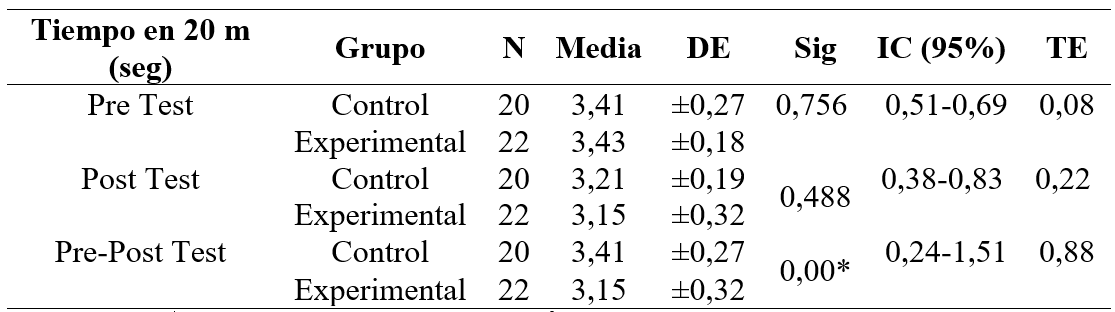 En la Tabla 3 se muestra el análisis intergrupo realizado con los datos obtenidos en el pre-test, post-test, así como en pre y post test en sprint de 20 metros. Se presentan condiciones de entrada similar y homogénea en el pre-test y post-test para ambos grupos sin diferencias significativas p=0,756 y p=0,488, solo en la comparación pre y post test se presentaron diferencias significativas (p=0,00). Similares resultados se observan en el tamaño del efecto, ya que al comparar el GC v/s GE solo el pre y post test presenta un tamaño de efecto grande (0,88) y en las comparaciones entre pre-test y post-test en el GC y GE se observaron tamaños de efecto trivial (0,08) y moderado (0,22), respectivamente.