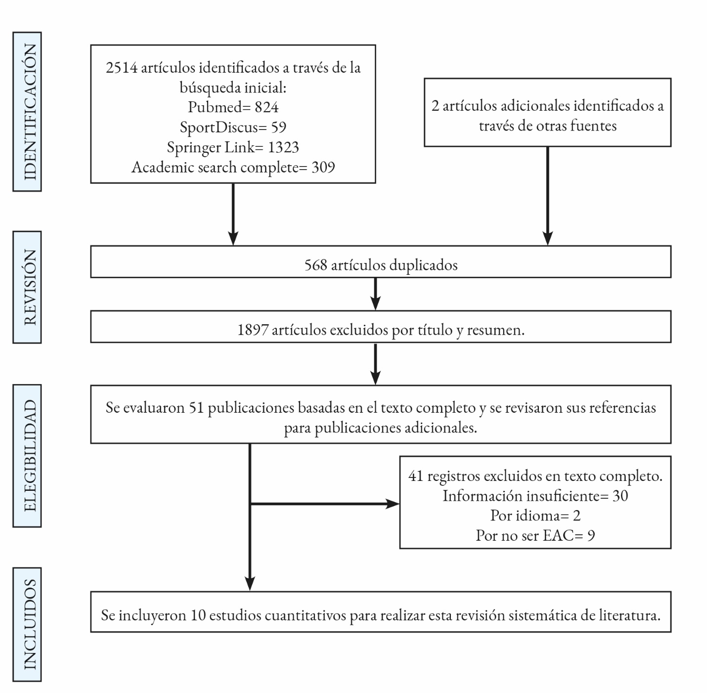 Se revisaron un total de 2516 estudios, donde finalmente se incluyeron 10 estudios cuantitativos que cumplieron con los criterios de elegibilidad (ver Figura 1). Se encontraron estudios publicados entre el año 2002 y 2018, no se evidenció ningún estudio posterior al año 2018. Los estudios incluidos obtuvieron en promedio un puntaje de 8.3 en la escala de calidad PEDro, lo cual representa una buena calidad de los estudios incluidos. Se analizaron un total de 413 pacientes con EAC de ambos sexos, con una edad promedio de 47.4 ± 18.4 años. Los programas de ejercicio físico promediaron 9.3 ± 6.1 semanas y 32.3 ± 15.4 sesiones.