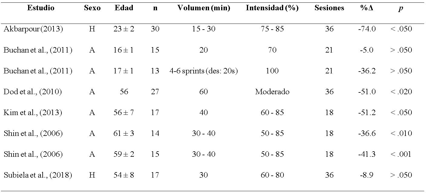 De lo anterior se infiere que, aunque se realice el EA con altas intensidades, se necesita un tiempo total de 30 minutos o más por sesión. Esto se demuestra en lo reportado por Buchan et al., (2011), donde reportaron que la IL-6 no disminuyó de manera significativa, ya que pasó de 3.8 ± 5.8 pg/mL a 2.4 ± 5.5 pg/mL (p > .050), para lo cual utilizaron un protocolo de intervalos de alta intensidad (HIIT, por sus siglas en inglés), el cual consistía en realizar de 4 a 6 repeticiones de sprints al 100% de la FCmáx, con descansos con pausas completas entre 20 a 30 segundos, lo que correspondía a sesiones menores a 15 minutos.