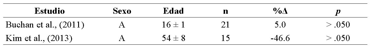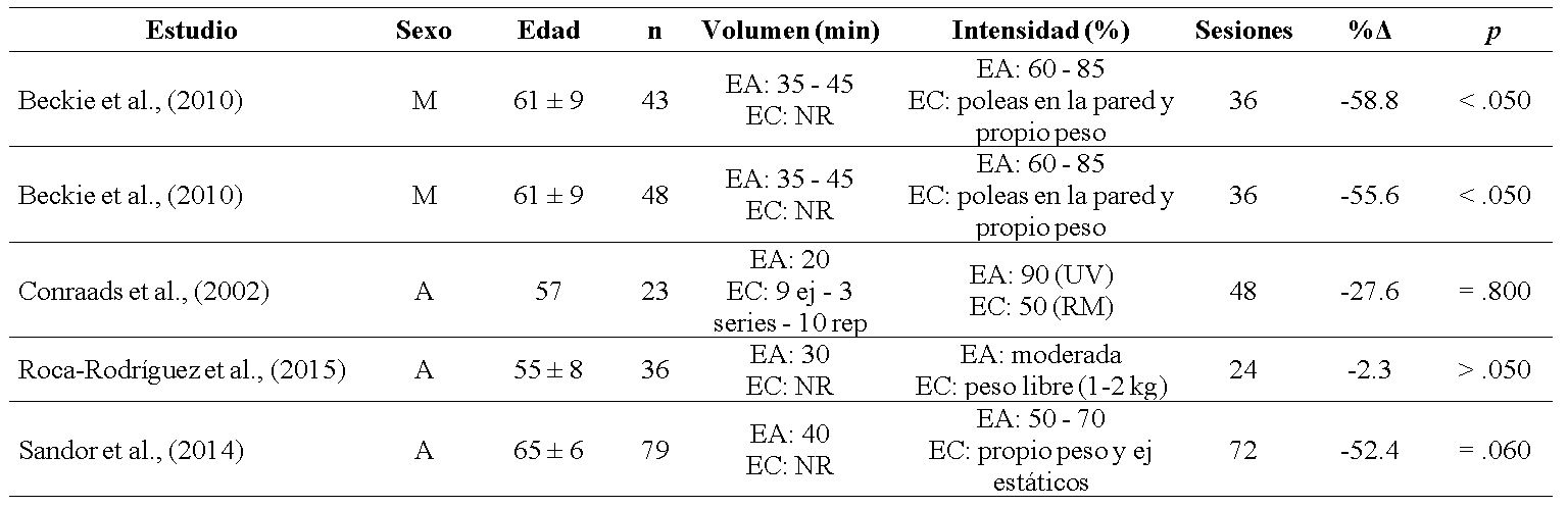 Con respecto al EC, se encontraron mejoras significativas entre un 52.4% y 58.8% (Beckie et al., 2010; Sandor et al., 2014), donde los estudios que realizaban una mayor intensidad en el EA presentaban efectos significativos y un mayor porcentaje de cambio (%Δ), como se muestra en la Tabla 2. No se evidenció diferencias entre los protocolos utilizados en el EA y en el entrenamiento de contra resistencia. En este último caso, los estudios incluidos no detallaron correctamente la cantidad de series, repeticiones, intensidad o metodologías utilizadas, lo que dificulta su análisis.
