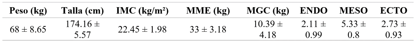 Los resultados encontrados en los futbolistas muestran un grupo de jóvenes con una edad promedio de 18 años ± 1.1 años. Como se puede observar en la Tabla 1, las características antropométricas de los deportistas muestran una talla con valores entre 186 y 165 cm, el peso se encuentra entre 87 y 55 kg, un índice de masa corporal (IMC) con valores entre 19 y 27 kg/m², la masa músculo esquelética con valores entre 27 y 40 kg y la masa de grasa corporal con valores entre 4 y 22 kg.