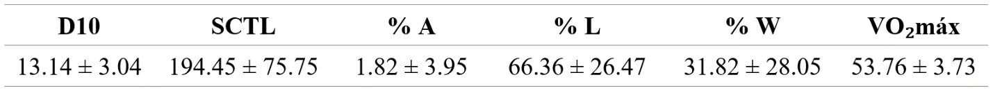 En cuanto a las características dermatoglíficas (Tabla 3), el tipo de diseño de huellas, la combinación del índice delta (D10) y la sumatoria de la cantidad total de líneas de los dedos de las dos manos (SCTL) se puede observar que los futbolistas del club Bogotano se caracterizan por una alta presencia de presillas, en segundo lugar verticilos y una carencia relativa de arcos. Los futbolistas presentan un consumo máximo de oxígeno promedio de 53.76 ± 3.73 ml/kg/min, lo cual representa normalidad en el VO2 (Sánchez y Salas, 2009).