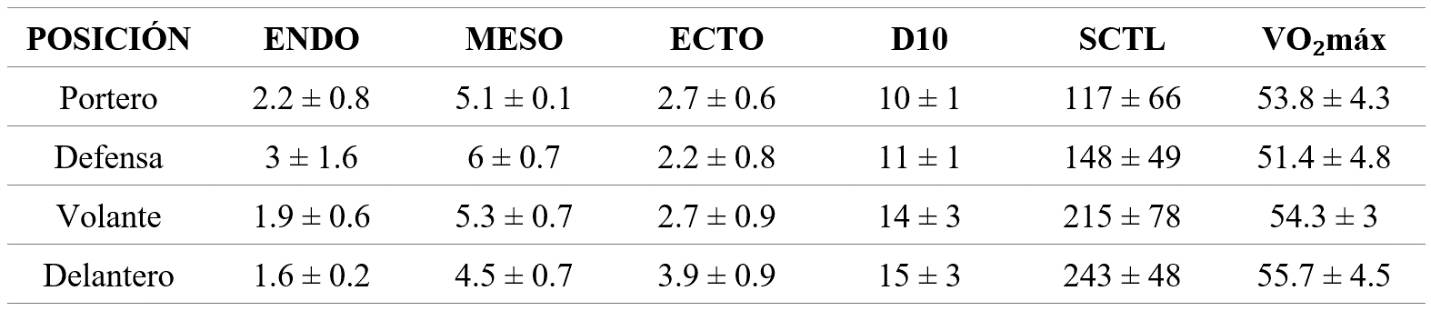 El perfil dermatoglífico por posición de juego, de acuerdo con el D10 y el SQTL presenta un desarrollo de velocidad y fuerza explosiva para los porteros, mientras que los volantes y delanteros tienen predisposición hacia la coordinación, resistencia y agilidad. El somatotipo para los volantes defensas y delanteros es meso-ectomórfico, los porteros poseen una tendencia hacia el componente mesomorfo balanceado.