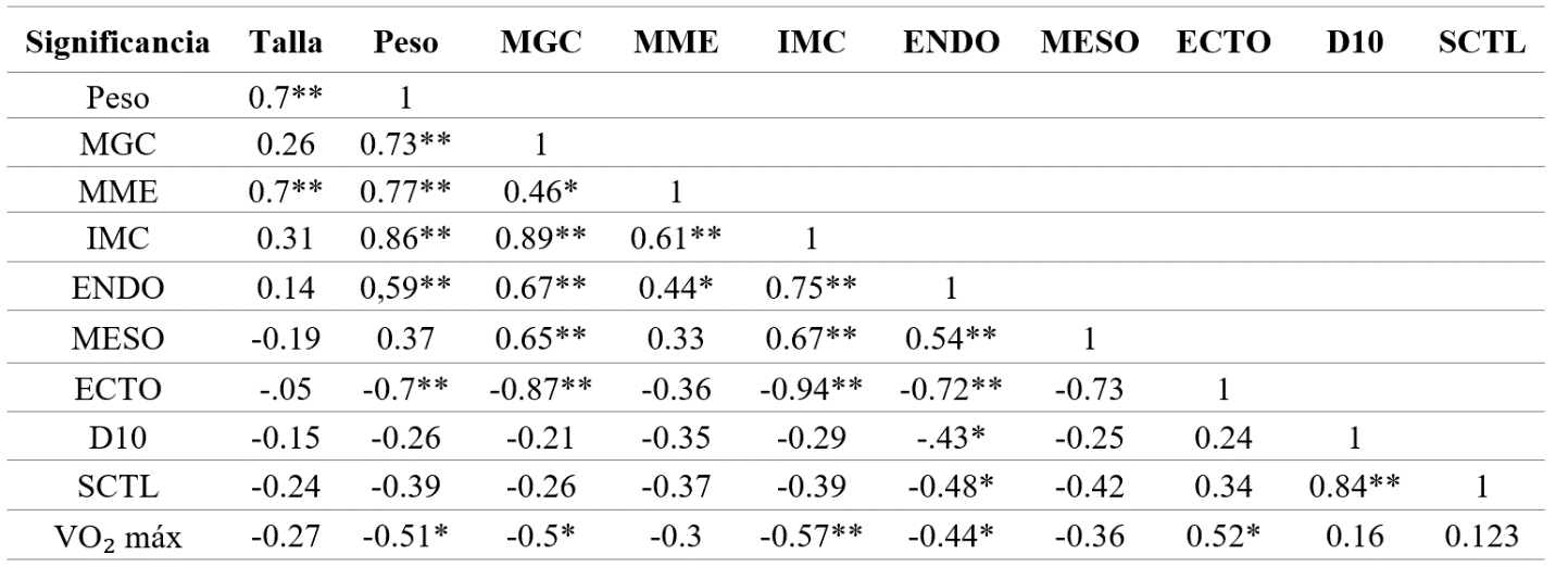 Por último, en los futbolistas bogotanos se observa una relación negativa entre los componentes dermatoglíficos con el somatotipo endomorfo; es decir, aumenta D10 y SCTL conforme disminuye el endomorfismo (p<0,05). Por otra parte, se evidencia la relación negativa entre componentes antropométricos (Peso, MGC e IMC) y el consumo máximo de oxígeno, entendiendo que, a mayor peso, MGC e IMC menor será el rendimiento presentado en las pruebas de VO₂ máximo. De igual modo, se infiere que a mayor endomorfismo menor rendimiento resulta en las pruebas VO₂ máximo. Adicionalmente, los componentes D10 y SCTL no tienen relación significativa (p >0,05) con el consumo máximo de oxígeno (Tabla 5). Sin embargo, se esperaba una relación estadísticamente significativa entre el consumo máximo de oxígeno y los datos encontrados en dermatoglifía, lo cual no se dio probablemente por el número de participantes en la investigación.