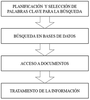 El procedimiento utilizado en este trabajo es similar a los existentes en la literatura científica (Gamonales, Gil-Sánchez et al., 2018; Gamonales, Muñoz-Jiménez et al., 2018, Gamonales et al., 2021). Una adecuada planificación de la búsqueda literaria favorece su éxito (Thomas, Silverman & Nelson, 2015), y permite extraer conclusiones relevantes (Gamonales, Gil-Sánchez et al., 2018), puesto que las revisiones de la literatura no sólo son un paso fundamental para el diseño de proyectos de investigación, sino para los investigadores, docentes o técnicos en Ciencias de la Actividad Física y del Deporte con la finalidad de informar en sus respectivas actividades profesionales (Benito et al., 2007). Todos los documentos seleccionados para el estudio cumplían con los criterios de inclusión establecidos. En la Figura 1, se expone el proceso de búsqueda llevado a cabo para el desarrollo de este trabajo.