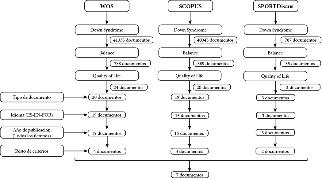 Fase 1. Planificación y selección de palabras clave para la búsqueda. Para determinar las palabras clave, se tuvo en cuenta los objetivos de la revisión literaria relacionada con la influencia del equilibrio en la calidad de vida de las personas con SD con la finalidad de localizar la mayor cantidad de manuscritos científicos relacionados. Para ello, se realizó la búsqueda de palabras clave en inglés, utilizando “Down Syndrome”, “Balance” y “Quality of Life”. Se establecieron los criterios de inclusión mencionados anteriormente (Tabla 1). En todas las bases de datos, se emplearon las mismas palabras clave, así como el mismo orden de búsqueda. Es decir, los términos claves y frase de búsqueda es vital en cualquier tipo de búsqueda de referencias bibliográficas (Benito et al., 2007). Por tanto, son acciones fundamentales para la búsqueda literaria, puesto que permite conseguir el mayor o menor número de trabajos (Gamonales, Muñoz-Jiménez et al., 2018; Gamonales et al., 2021).