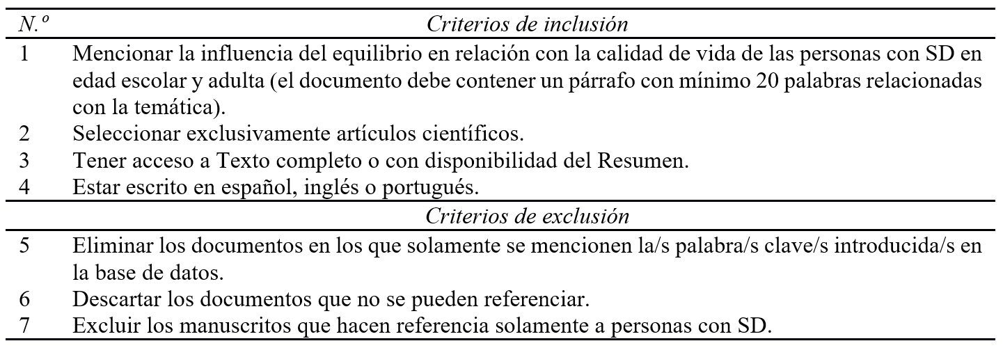 Para la búsqueda y selección de documentos, se emplearon las palabras clave: Down Syndrome, Balance y Quality of Life. Además, los manuscritos seleccionados para formar parte de la muestra debían de cumplir con los siguientes criterios de inclusión (Tabla 1).