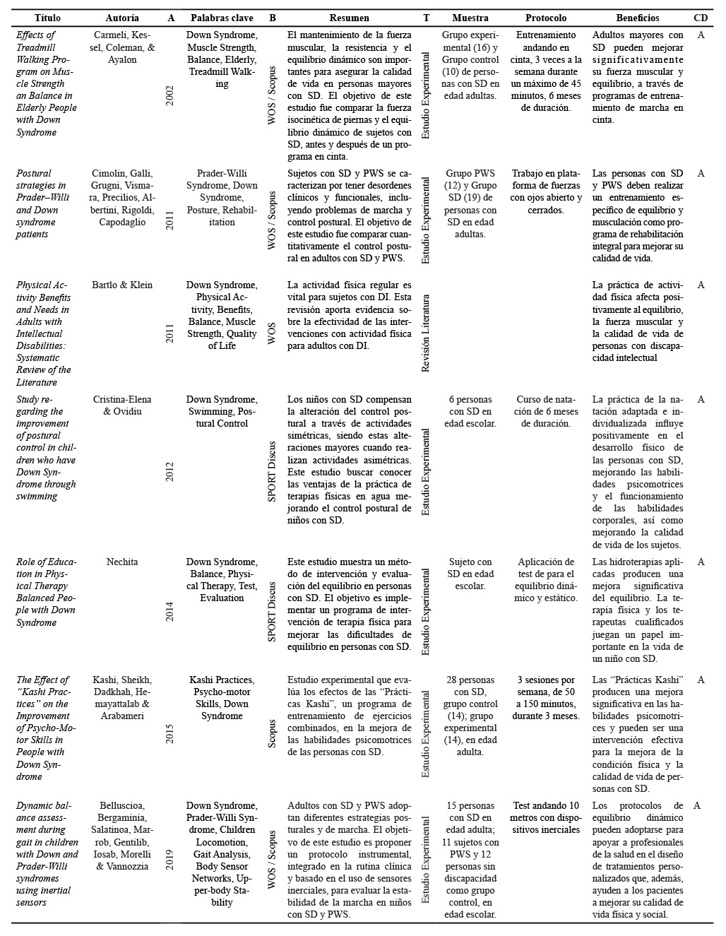 Por ello, ante la escasez de documentos científicos relacionados con esta temática, y analizando las distintas bases de datos, se muestra conveniente realizar una nueva revisión de la bibliografía que complete el estado del conocimiento en torno a la investigación en personas con SD en edad escolar y adulta, así como la importancia del trabajo del equilibrio con la finalidad de mejorar su calidad de vida.