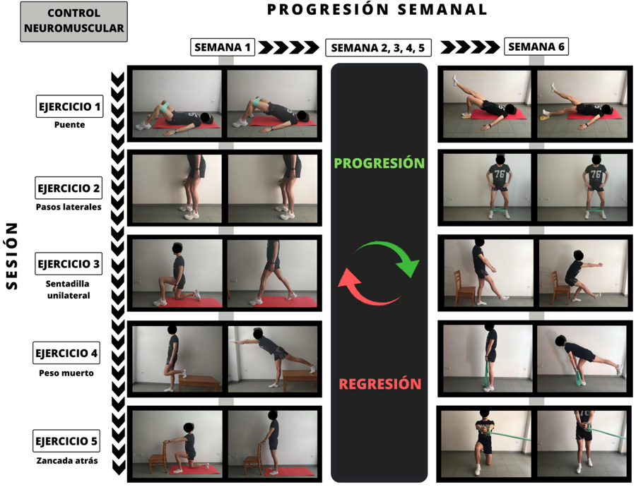 Compuesto por 5 ejercicios (puente de glúteos; wall press y pasos laterales; progresiones para la sentadilla unilateral; peso muerto, y, finalmente, la zancada posterior) relacionados con el componente de dominancia de cuádriceps y dominancia de pierna, planteados por Hewett et al., (2010). A partir de ellos, se pueden ir extrayendo las distintas progresiones semanales de cada uno, lo que facilita su comprensión y dinamismo en la sesión. Además, permiten que el sujeto avance o retroceda dependiendo de su evolución a lo largo del programa (Figura 3).