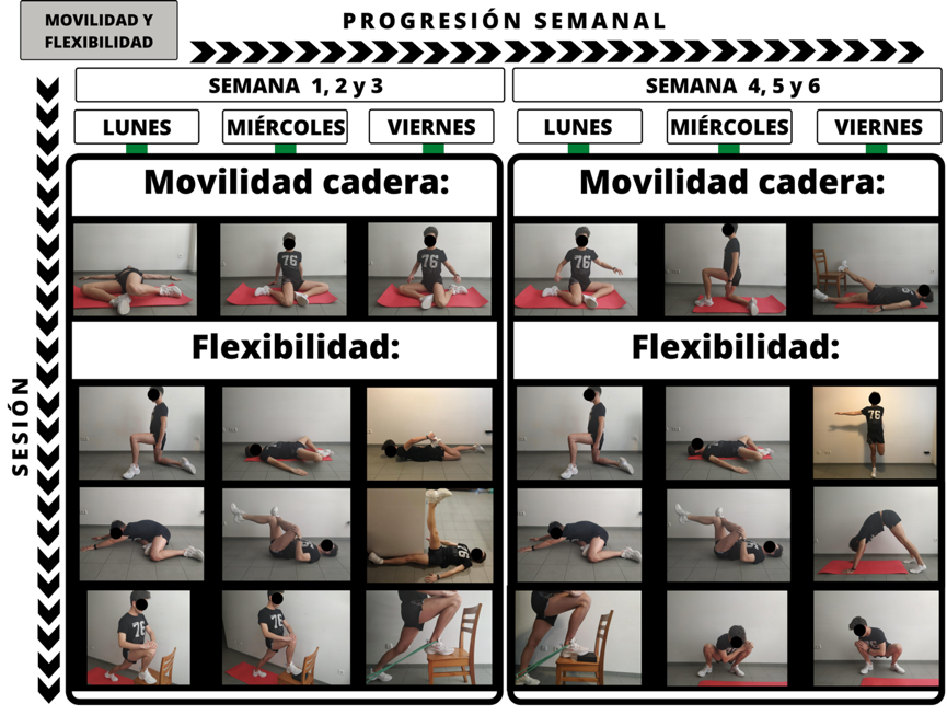 Se estableció una duración de 6 semanas para lograr que se mantengan los efectos del programa, una vez que se reanude la actividad (Acevedo et al., 2014). Por otro lado, se planteó una progresión ascendente, en cuanto a la complejidad de los ejercicios, de forma que se asegure su correcta ejecución y asimilación.