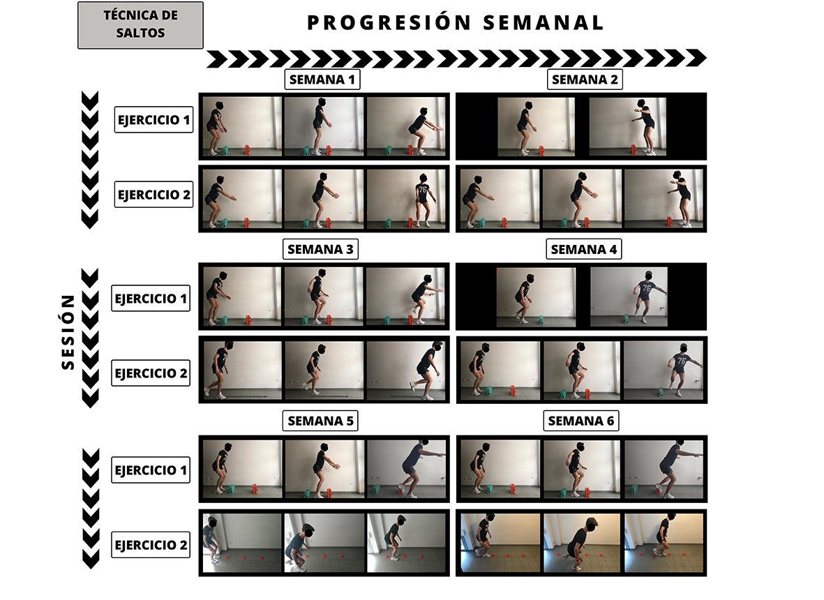 Se propone un trabajo de saltos en distintos planos, según el mecanismo multiplanar que caracteriza a la lesión de LCA en mujeres (Quatman & Hewett, 2009). Además, se trata de acercar a la futbolista a movimientos propios del deporte, aproximándola hacia estímulos de carácter unilateral y con cambios de dirección, de acuerdo con el principio de especificidad. Por otro lado, se plantean volúmenes (de entre 48-100 saltos) e intensidades iniciales inferiores a los promovidos para programas que se orientan a la mejora de fuerza y capacidad de salto (Copoví, 2015; McNeely, 2005), ya que el objetivo de este bloque es la mejora de la técnica de salto, poniendo el foco en la prevención de lesiones. De esta forma, se asegura una adecuada progresión, que favorezca la correcta ejecución de los ejercicios.