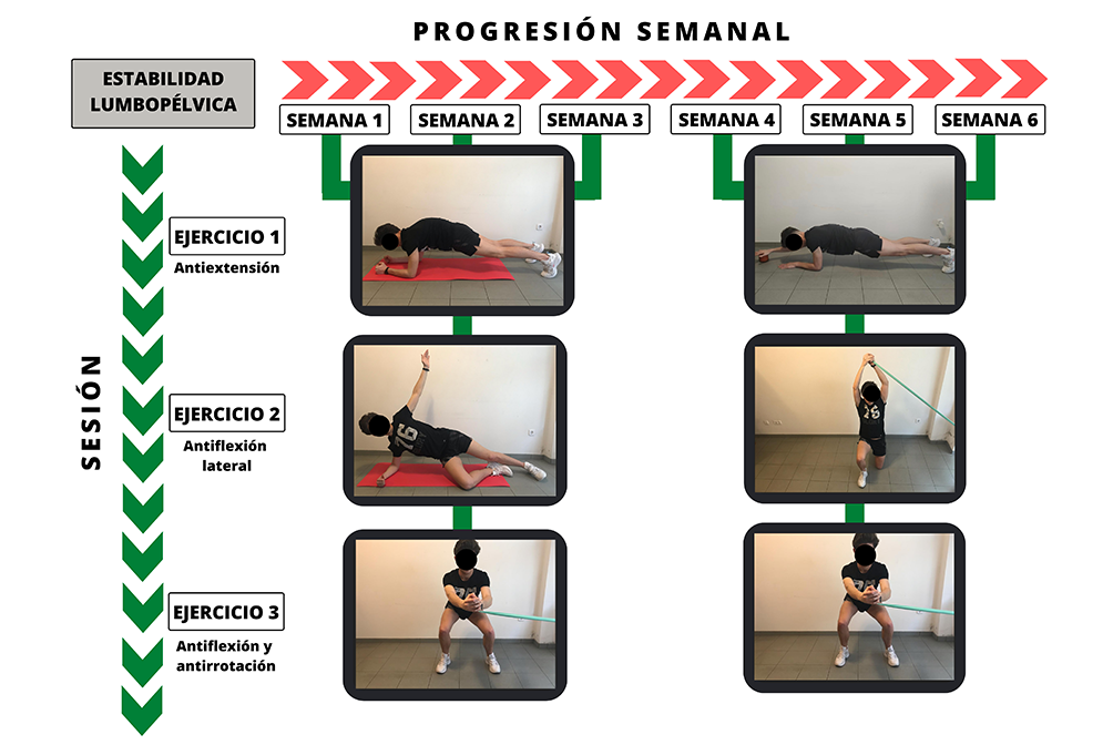 Este trabajo consistirá en realizar 2 series de 3 ejercicios (antiextensión; antiflexión lateral; antiflexión y antirrotación), en progresión vertical, sin descanso entre series, durante un tiempo total de 4,5 minutos de trabajo. Se comenzará con 30 segundos y descansando 15 segundos, hasta completar el tiempo total. Nuevamente, se establece una progresión semanal de los ejercicios, en cuanto a demandas de estabilidad (Figura 5).