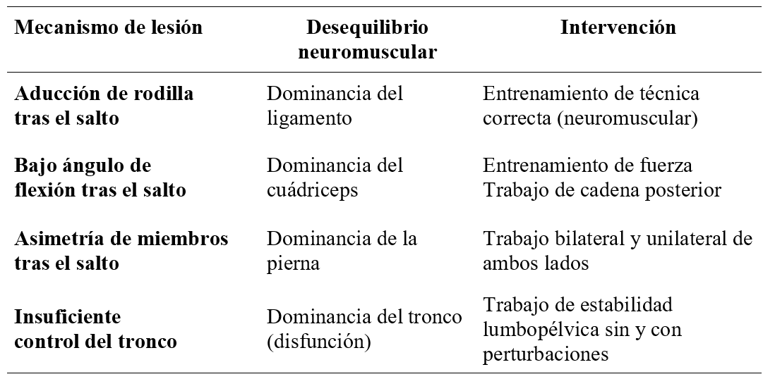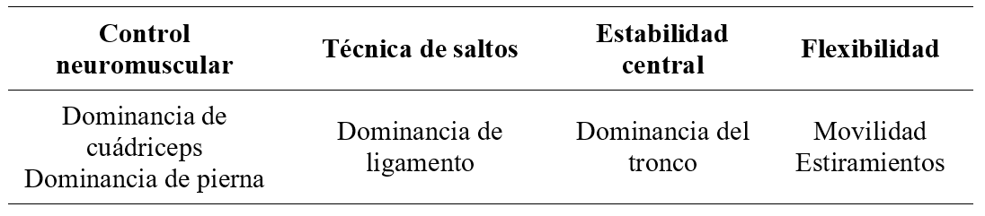 En el proceso de incorporación de medidas preventivas, se identificaron las áreas de trabajo sobre las que se va a centrar el programa, siguiendo la clasificación que proponen Hewett et al. (2010), debido a que relacionan de manera muy sencilla los factores de riesgo y los mecanismos de lesión, con su correspondiente intervención (Tabla 1).