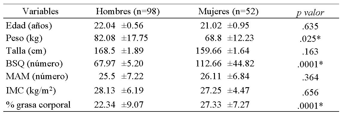 En la Tabla 1 se presentan las características generales de la muestra y los resultados al comparar entre hombres y mujeres. Se observaron valores promedio de edad 22.04±0.56 años, estatura (talla) 168.5±1.89 cm, peso de 82.08±17.75 kg; IMC 28.13±6.19 (kg/m2); en el BSQ 67.97±5.20; en el MAM 25.5±7.22, porcentaje de grasa de 22.34± 9.07. En cuanto a las mujeres se obtuvieron los siguientes promedios de edad 21.02±0.95 años; peso 68.8±12.23 kg; estatura 159.66±1.64 cm; 27.25±4.47 (kg/m2); BSQ un puntaje de 112.66±44.82; MAM 26.11±6.84, y, finalmente, en el porcentaje de grasa 27.33±7.27. De las variables mencionadas se encontraron diferencias estadísticas significativas en tres de ellas, peso (t= 3.069; p=.025), BSQ (t=3.064; p=.001) y %grasa (t=3.023; p= .0001). Donde los hombres pesan un 16 % más que las universitarias; sin embargo, las universitarias presentan 40 % más de insatisfacción corporal y 19 % más porcentaje de grasa que los hombres.