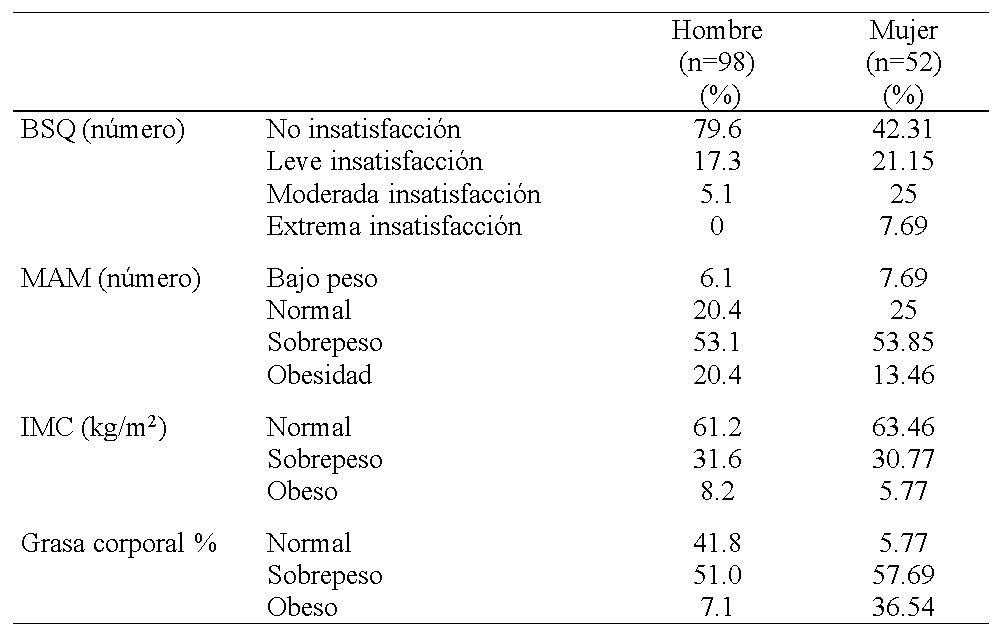 Resultados: Entre los principales hallazgos se presentaron diferencias entre hombres y mujeres tanto en el BSQ como en el porcentaje de grasa, no así en el MAM y en el IMC donde no se encontraron diferencias significativas.