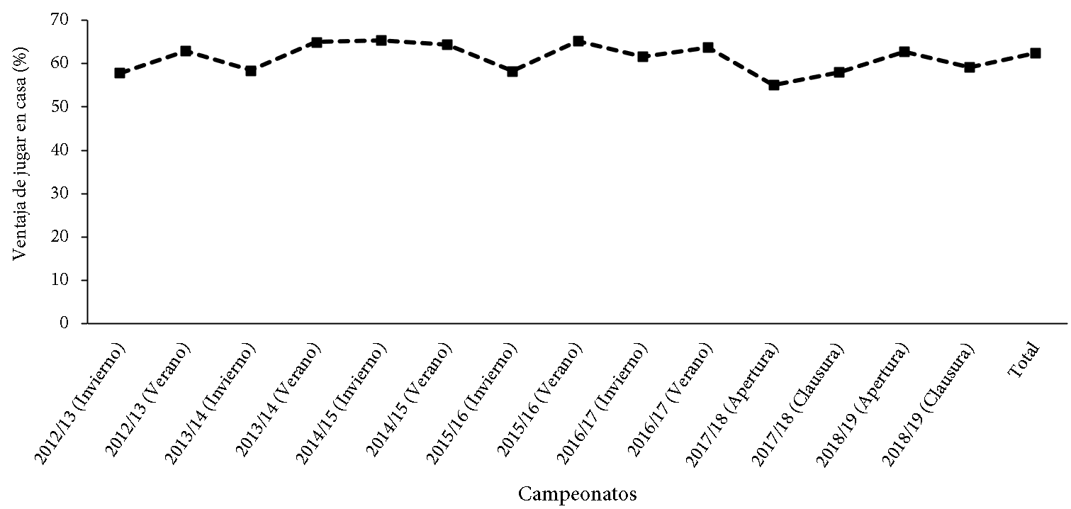 En la liga brasileña, al analizar 5047 partidos jugados en casa de los campeonatos desde el 2000 hasta el 2011, de las ligas A y B, se encontró que un 50,5 % corresponde a victorias, 25,8 % a empates y 23,7 % a derrotas (Leivas et al., 2013). En la liga A australiana de fútbol, el 58 % de puntos de competencia ganados se consiguió cuando se disputaron partidos en casa (Goumas, 2014), mientras que en la liga turca 61,5 % se atribuyó a esos puntos (Seçkin y Pollard, 2008). En ligas europeas locales, los equipos que quedaron campeones obtuvieron un ventaja de jugar en casa que osciló entre 61,1 % y 69,9 % (Saavedra et al., 2015). Incluso, este indicador muestra una correlación positiva con las posiciones ocupadas por los equipos en el ranking de las ligas (Ramchandani et al., 2021).